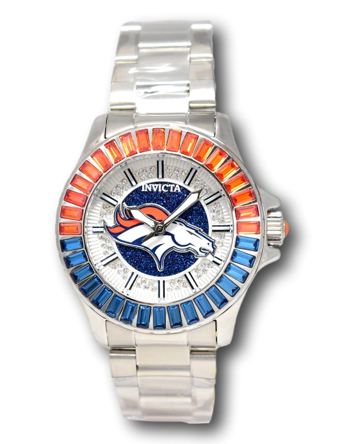 New - With Tags New and Unworn - Guaranteed Authentic - Includes Blue Invicta NFL Box and Warranty Card 100% Functional - This listing includes real pictures of the actual watches for sale These NFL watches are made in limited small batches, and once they sell out are hard to find! Rare and collectible model. Watch features: 96 individual crystals! 36 crystals around the watch bezel, and 60 on the watch dial. Case Size : 38mm or about 42mm wide including the crown Thickness: 12.5 mm Weight: about 4.7 ounces Items included: Blue Invicta NFL Box and Warranty Card Max wrist size: 7.75 Inches Case and Dial Case Size: 38mm Case Material: Stainless Steel Bezel Material: Stainless Steel Bezel Color: Blue, Orange, Silver Crown Type: Push Crystal Type: Flame Fusion Dial Material: Metal, Glitter Movement Caliber: PC21J Function Type: Quartz Water Resistance Water Resistance: 100m Band Material: Stainless Steel Tone: Steel Length: 175mm Size: 20mm Stones Type: Crystal Quantity: 17, 19, 56 Size: 1.0MM, 4.0MM Color: Blue, Orange, White