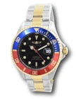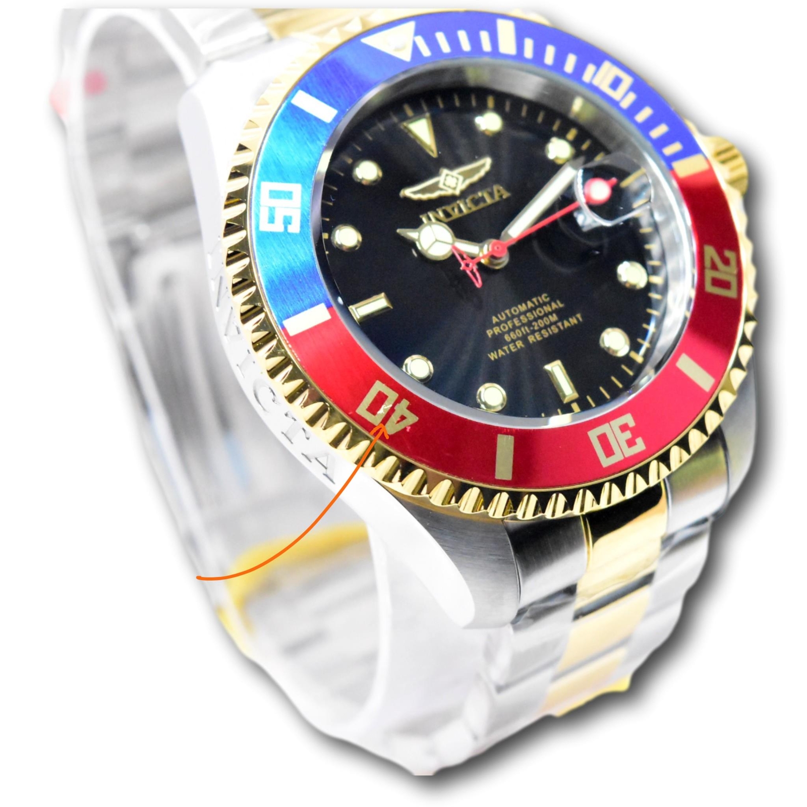 New - With Defects New and Unworn - Small imperfection marks / scratches on the watch bezel near 8 o clock area as pictured - watch is otherwise NEW and 100% Functional Guaranteed Authentic - Includes Yellow Invicta Box and warranty card 100% functional - Pictures are of the actual watches for sale Watch features Japanese automatic movement made by Seiko - luminous hands and hour markers, screw down crown for 200M water resistance Watch is about 47mm wide or about 52mm wide including the crown - watch is about 15mm thick - watch weighs about 7.2 ounces Case size: 47mm wide or about 52mm wide including the crown Thickness: 15mm Weight: 7.2 ounces Items included: Yellow Invicta Box and warranty card Max wrist size: 8.5 inches Case and Dial Case Size: 47mm Case Material: Stainless Steel Bezel Material: Stainless Steel Bezel Color: Blue, Red Crown Type: Screw Down Crystal Type: Mineral Dial Material: Metal Case Back: Exhibition Movement Caliber: NH35A Function Type: Automatic Water Resistance Water Resistance: 200m Band Material: Stainless Steel Tone: Steel, Gold Length: 215mm Size: 22mm