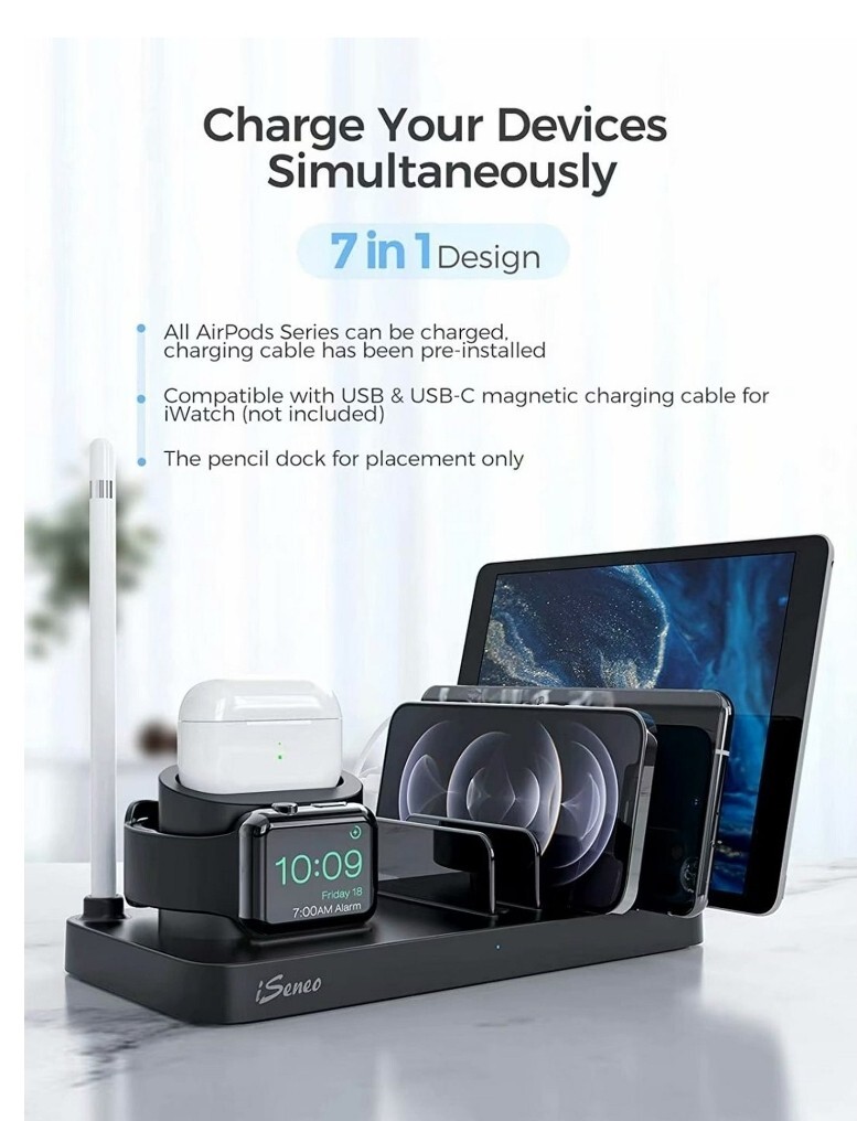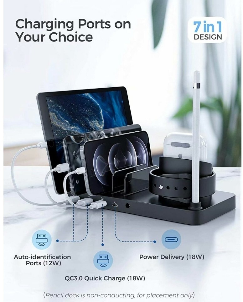 Specification: Highlights: 1. A charging cable for AirPods is included in the package, which is already preinstalled. 2. Multifunctional combined charging stand, which provides fast charging for your multiple devices. 3. Package contains a 40.5W high-power adapter, no additional purchase is required, which is more convenient to use. 4. The output of USB-C PD port & QC3.0 USB ports reach 18 Watts, which support fast charging for your devices.