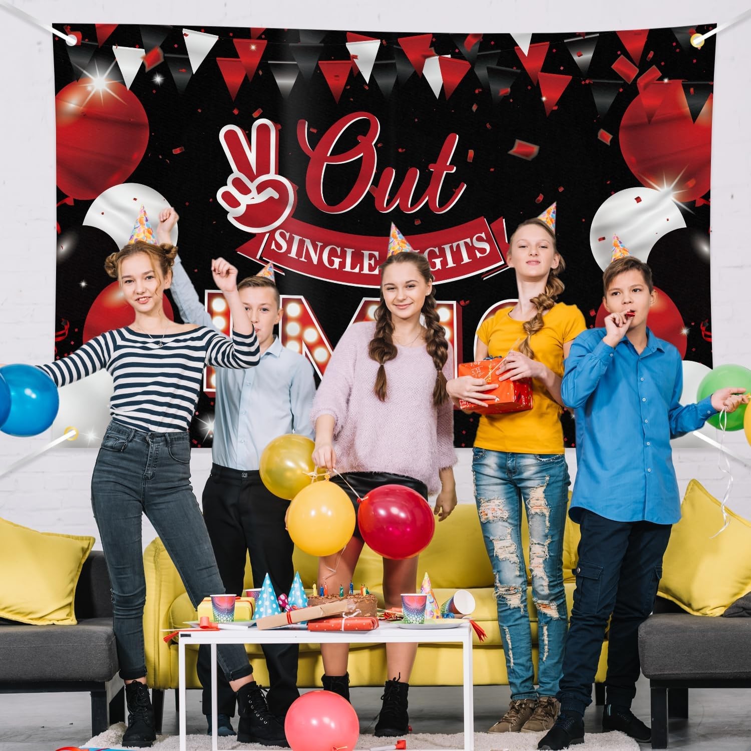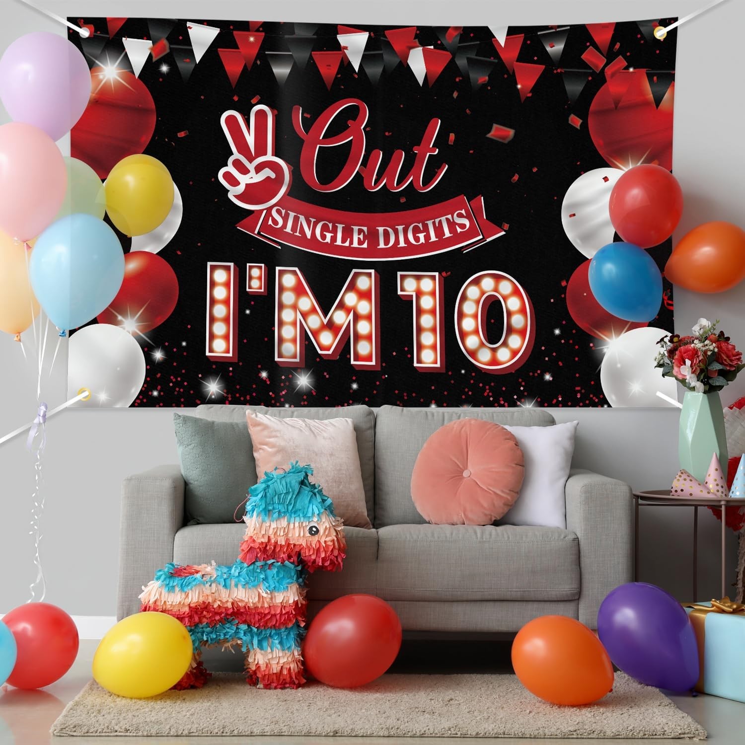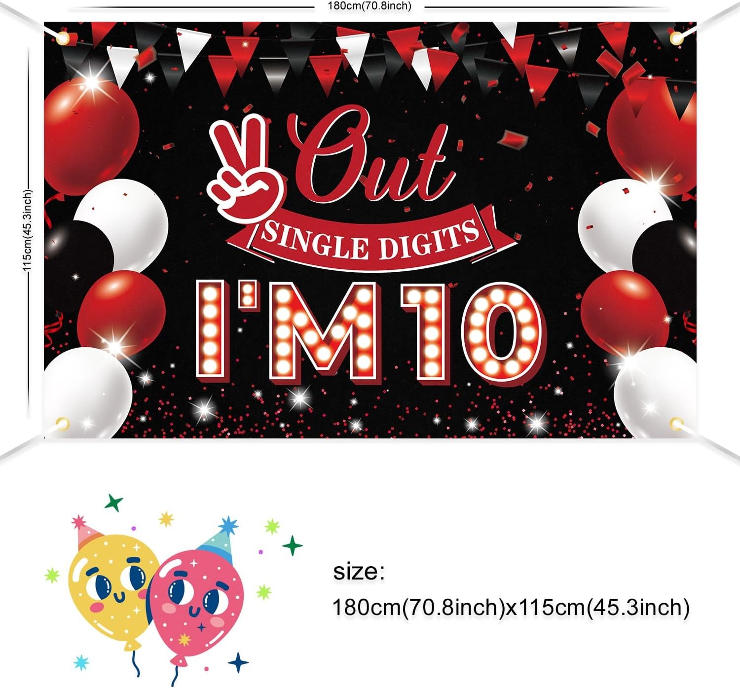 JOYKY Out Single Digits I’m 10 Banner, Red Black Happy 10th Birthday 10 Product Details Product Dimensions: 70.8 x 45.2 x 0.04 inches Item Weight: 5.3 ounces Manufacturer: JOYKY Item model number: 004-10 Theme: Occasion Color: Red 10 Brand: JOYKY Recommended Uses For Product: Decor Occasion: 10th Birthday Material: Polyester Specific Uses For Product: Indoor 10th Birthday Decoration Product Dimensions: 70.8"L x 45.2"W Fabric Type: polyester Target Audience: Children YOU WILL GET - 1 piece of red black Out Single Digits I’m 10 banner (70.8 X 45.3 inches / 180 X 115 cm) and 1 piece of 33 ft long string. VIVID COLOR - We use digital printing technology to print our banners with high color fastness, clear patterns, and vibrant colors. After high-temperature printing, the colors are not easily faded and remain new for a long time. PREMIUM MATERIAL - Made of high-quality 100D polyester fabric, it is lightweight, durable, and not easily faded, making it perfect for girls boys 10th birthday decorations for both indoor and outdoor parties. EASY TO USE - All four corners of the banner have grommets made of solid copper. To decorate your 10th birthday party, simply use the rope that comes with and hang it as a wall background, dessert table decorations or a photo backdrop.