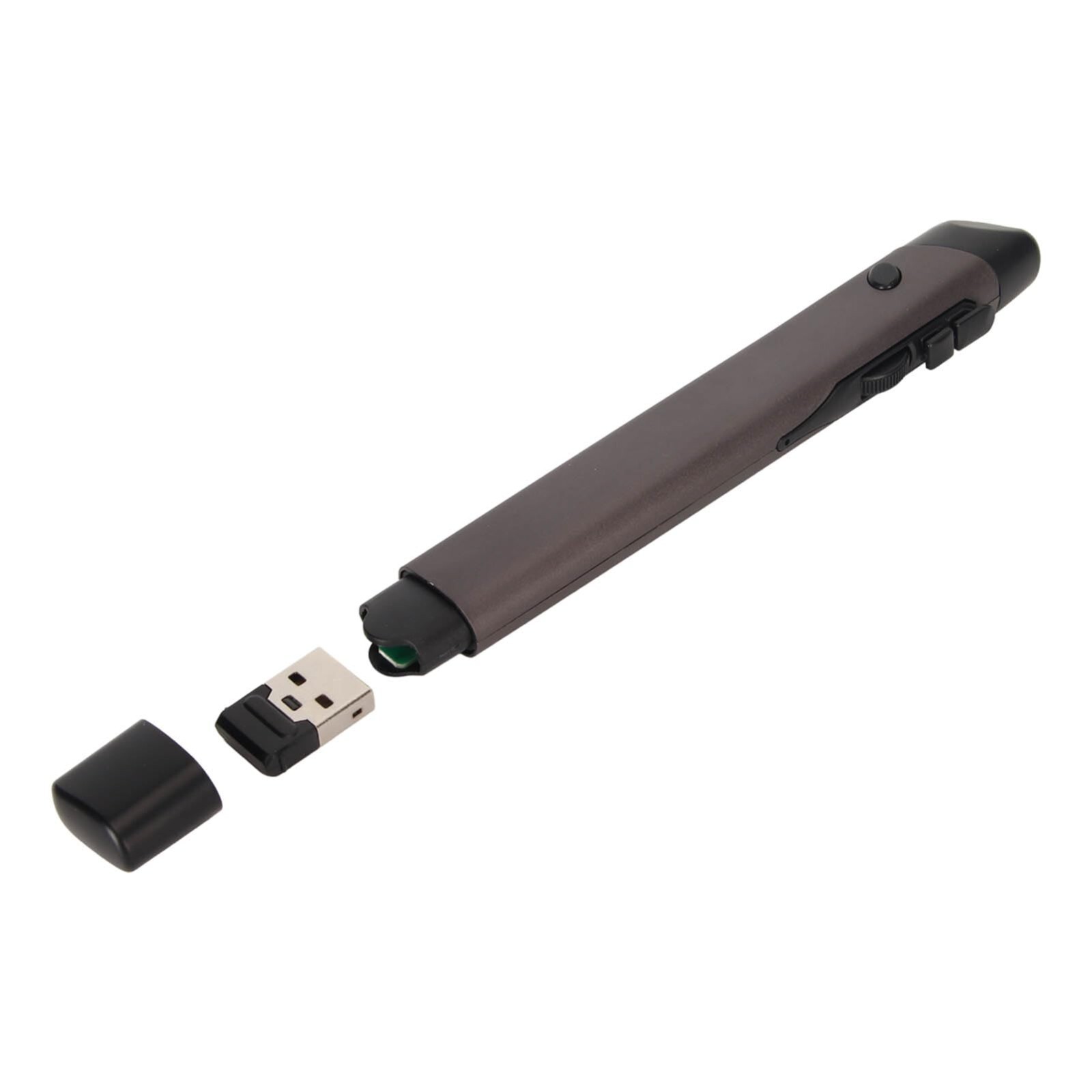 Refurbished/ Tested: The Jectse Wireless Optical Pocket Pen Mouse is a gray pen mouse with 4 buttons, operating on a 2.4GHz wireless USB connectivity. It utilizes an optical tracking method and is compact for easy portability.