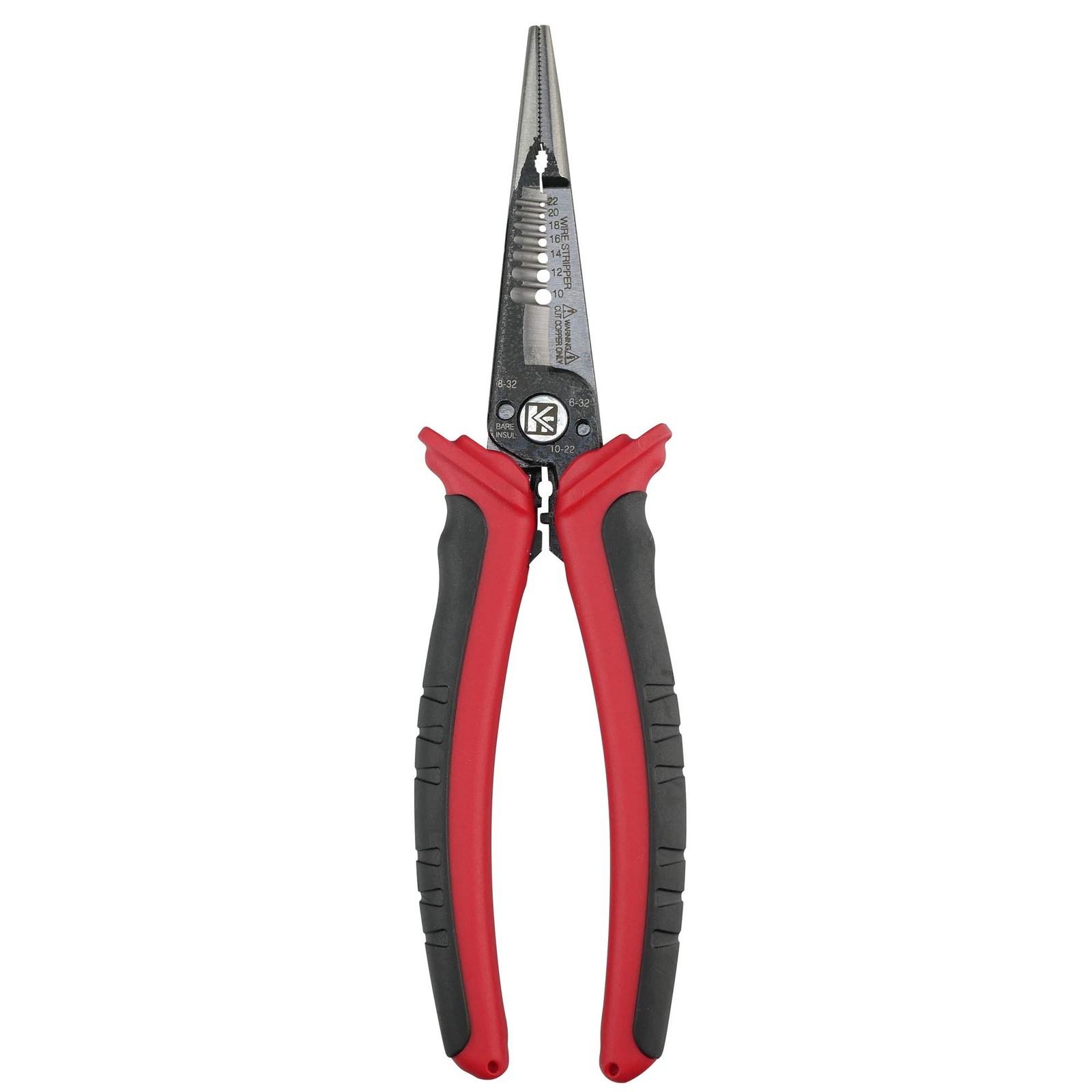 K601 6-In-1 Combination Wire Service Tool, Stripping Crimping and Gripping Pliers, 8-1/2" Electrician Pliers 8-1/2" All-purpose pliers - This newly designed installation pliers eliminates the need for other tools by featuring the basic functions that are essential for electrical installation: long nose gripping pliers, bolt cutter, wire strippers and crimpers for end sleeves and cable shears. With the following 6 functions: cutting cable, stripping and crimping, gripping flat and round material, bending and bolt cutting; this combination pliers specific designs that allows professionals to carry less tools and get more done. • 8-1/2" Long Nose Pliers • Bolt/Screw Extractor • Wire Stripper - 10, 12, 14, 16, 18, 20, 22 AWG stranded and 8-20 AWG solid wire • Wire Cutter • Bolt Cutter - #6-32 and #8-32 screw • Crimps Fastener - 8-22 AWG Insulated and non-insulated terminals Wire Stripping: Strip 8-20 gauge solid wire. Alternatively, strip 10-22 gauge stranded wire Crimping: 8-22 gauge insulated and Non-insulated end sleeves Cable Cutting: Heat treated steel blade performs precise cutting for copper and aluminum cables Bolt Cutting: Thread and cut 6-32 and 8-32 bolts to preferred length Long nose gripping and slip-resistant rubber grip handles