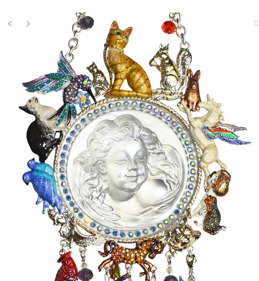 HEAR THE MUSIC OF THE CHIMES AND REMEMBER YOUR BELOVED PET! A collection of our beloved pets circle around a sleepy Dream Angel on the Rainbow Bridge Dream Angel Windchime. The angel is lulled to sleep wrapped in her feathered wings and as she sleeps she lets in only the good dreams. Crystals and chimes and more friends sway from below the Angel. She is guardian over all our friends on both sides of the bridge. Plated Sterling Silvertone. Measures approximately 5 ½" wide x 20" long.