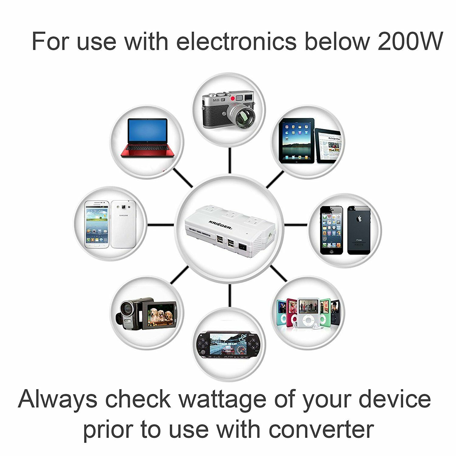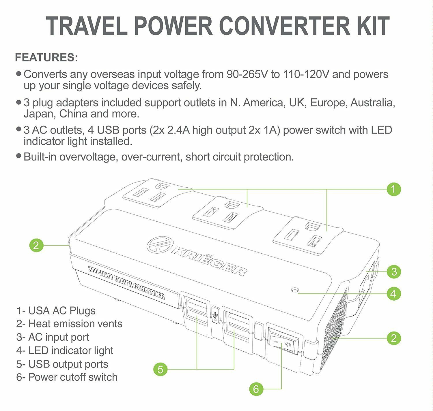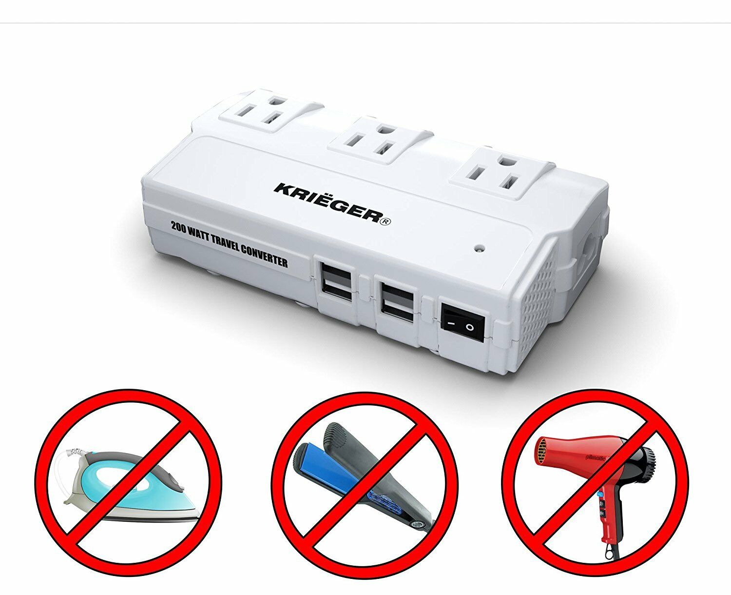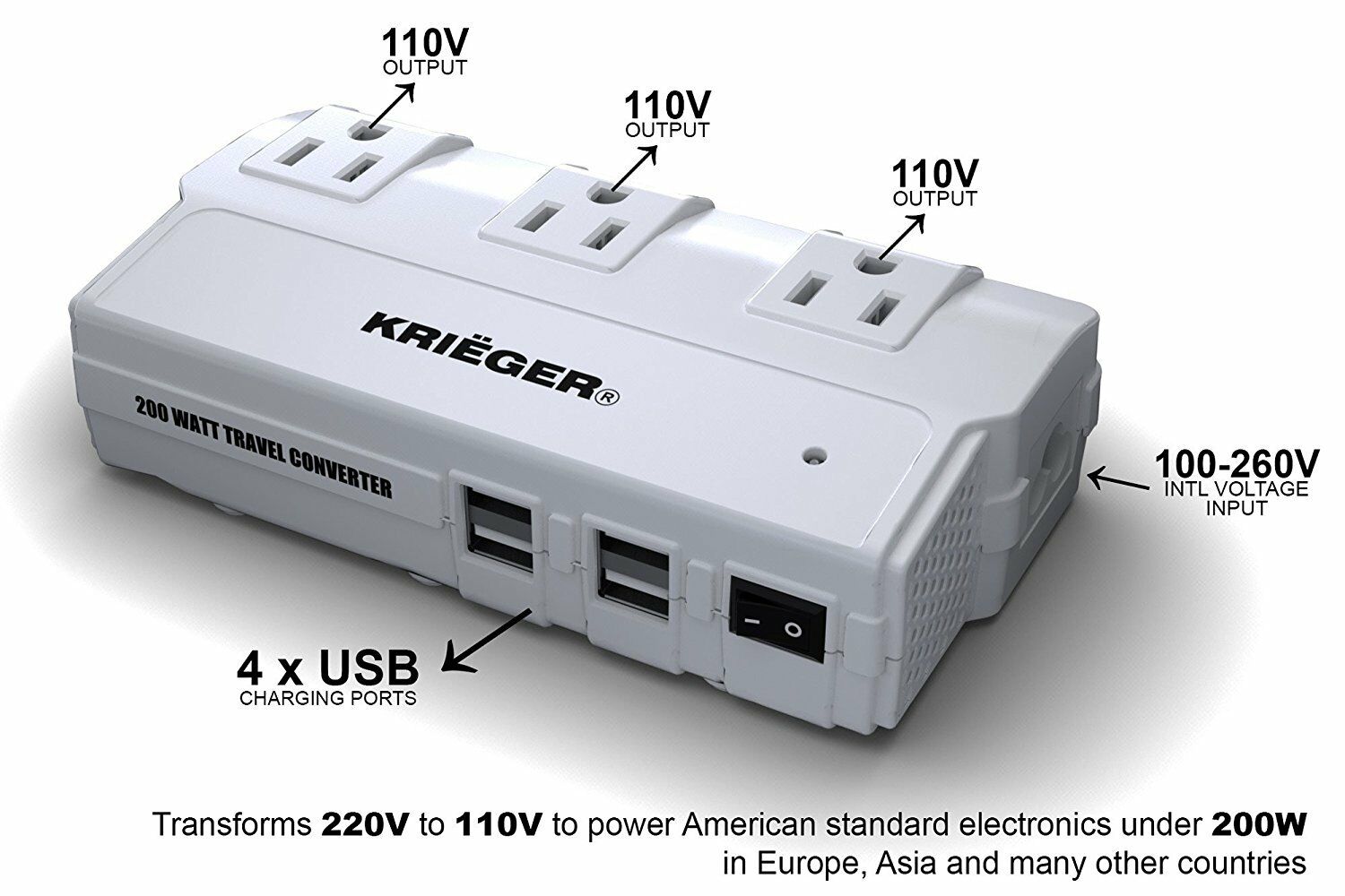 KRIËGER KRV200-W 200W Travel Converter Voltage Transformer Step Down 220-230 Volt to 110V Adapter PRODUCT OVERVIEW This travel kit converter is a versatile power converter that allows you to connect up to 3AC devices with a total of 200-Watt capacity, as well as charge 4-items at the same time through the USB output. When simultaneously charging multiple devices, make sure that its total wattage is less than 200-Watt in order to avoid over-heating or damage. The Krieger 200-Watt travel adapter and power converter is your ideal companion for your international travel. Converts overseas voltage from 90-220-Volt to 110-120-Volt and powers up your US electronic device safely. Boasts 3AC outlets and 4-USB charging ports and charges at least 6-devices simultaneously. 3-plug adapters included support outlets in North America, United Kingdom, Continental Europe, Australia, Japan, China etc., covering more than 150 countries around the world. Warning: Please do not use this power converter to power your hair dryer, hair straightener or curling iron Input voltage: 90-Volt 265-Volt AC AC output power (accumulative): 200-Watt rated, 230-Watt maximum, AC output: 110-Volt AC USB output: DC5V/4.2 Amp rated, 6.0 Amp max (4-USB ports accumulative), the 2-USB ports closest to the power switch are 2.4 Amp each and the other 2 are 1 Amp each Protections: over-current, over temperature, output short-circuit, surge protection 3 plug adapters included support outlets in North America, United Kingdom, Continental Europe, Australia, Japan, China etc., covering more than 150 countries over the world AC output: 110-Volt AC USB output: DC5-Volt/4.2 Amp rated, 6.0 Amp max (4-USB ports accumulative) the 2-USB ports closest to the power switch are 2.4 Amp each and the other 2 Amp are 1 Amp each Warranty / Certifications Manufacturer Warranty - 1 Year