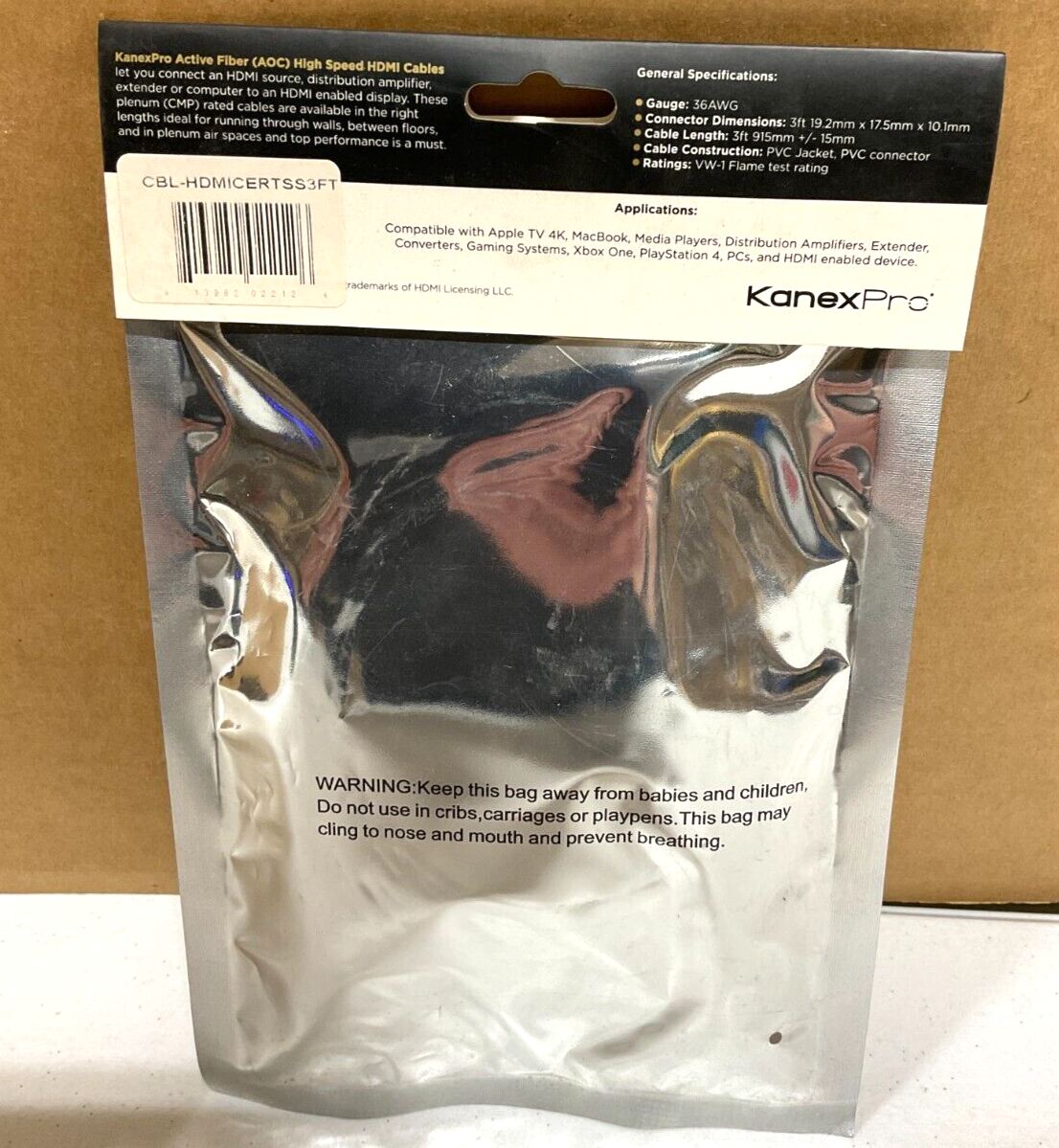 KanexPro HDMI Cable with Ethernet 3 feet CBL-HDMICERTSS3FT Brand New! Factory Sealed! Connect your 4K HDR devices with the 3' KanexPro CBL-HDMICERT3FT Slim Premium High-Speed HDMI Cable with Ethernet . It supports HDR video and resolutions up to 4K UHD at 60 fps, plus 3D video and object-based audio. Gold-plated connectors provide enhanced signal transmission, and the PVC jacket helps protect the inner cabling. Enhanced Support This cable supports all HDMI resolutions up to 4K UHD (3840 x 2160 @ 60 fps), including 3D and Multi View video; HDR10, HLG, and Dolby Vision HDR formats; Multi-channel audio up to DTS:X and Dolby Atmos; SA-CD, DVD-Audio, DTS-HD Master Audio, Dolby TrueHD, and other high-definition audio standards; Deep Color, up to 16 bits per channel, and x.v.Color; CEC commands and functions, HDMI Ethernet Channel, and Audio Return Channel; 16-bit color at 1080p, 8-bit color at 4K UHD, and 10-bit HDR at 24 fps (BT.2020) Additional Features Certified by HDMI Authorized Test Centers to support the high-bandwidth HDMI 2.0b specification-enabled features Tested to 18 Gb/s with an EMI (electromagnetic interference) test 600 MHz maximum pixel clock