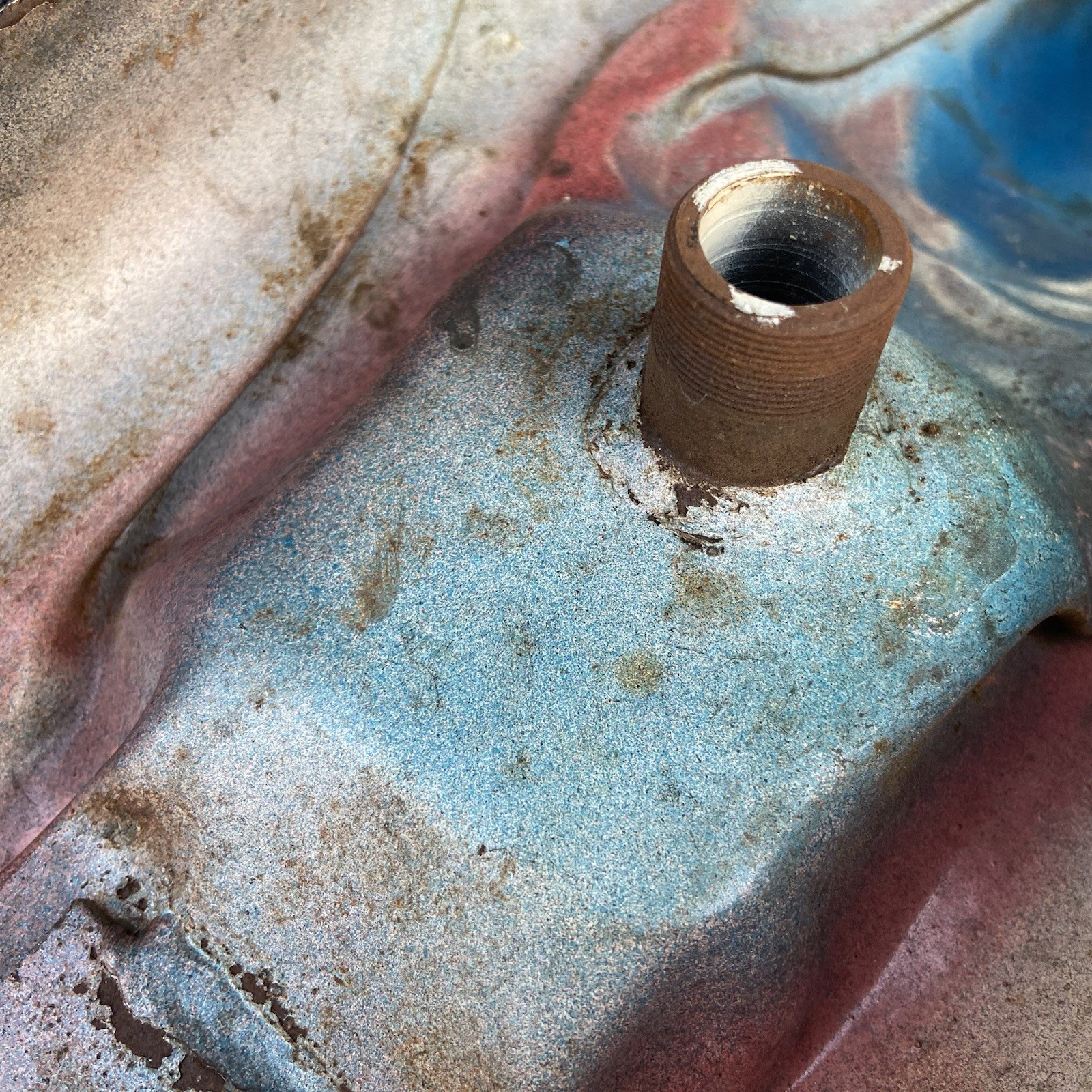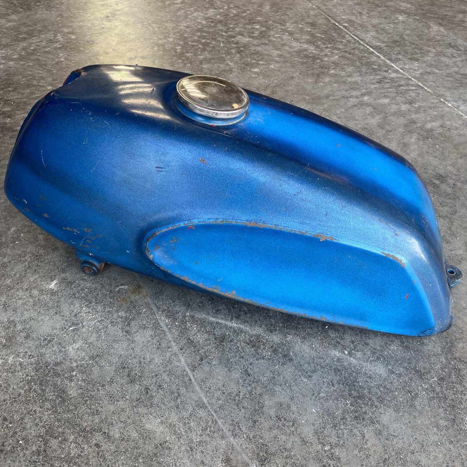 Nice tank for restore and paint, I have not leak tested the tank. Has been repainted. No major dents but has some minor ones as shown in photos. It really is in pretty decent shape overall. Inside is fairly clean but there is some sediment/ loose debris inside and some surface rust. Inspect photos closely for condition