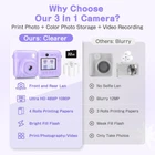 Kids Camera Instant Print, Dual-Lens 48MP Digital Camera for Christmas Birthday Gifts, 1080P Selfie Instant Cameras for Kids with 32GB Card, Instant Print Digital Camera for Girls Boys-Purple MORE BENEFITS 📷 Dual-lens Instant Print Camera: 3-in-1 front and rear digital camera can take selfies to capture wonderful moments in HD during festivals or travels; The kids camera has an instant printing function that can print black and white photos in just 1S fast. 32GB card can also store over 2500+ color photos for printing anytime, anywhere; FHD 1080P video camera take selfies and blogs anytime. Black and white printing+color storage+video recording with dual-lens photography, very convenient! 📷 Upgraded 48MP Instant Camera: This print digital camera has been upgraded to 48MP super HD pixels to take clear photos! The kids camera has a 2.4-inch screen, 1080P video, 16x digital zoom, fill light, time-lapse photography, continuous shooting, timer, playback, 25+ filters and sticker frame, and selfies. Anime sketches, photography, painting, 1080P recording, and taking selfies during holidays are a favorite form of entertainment for families and children. 📷Safe Durable Material: Kids instant camera adopts advanced thermal printing technology, the printing paper materials are safe and environmentally friendly, odor-free, and non-toxic, which is safer and more assured. High-quality soft shockproof shell and long neck strap effectively protect portable travel camera against drops. Safe and reliable toys let parents needn't worry. It can be connected to a computer through a USB-C cable to transfer photos or videos from the camera. 📷Portable & Long Battery Life: The potable instant print camera allows for faster charging and saves time. After fully charging, the travel compact camera can continuously take photos or record videos for 3-4 hours! Camera with 1*32GB micro SD card can store 2500+ photos(MAX 128GB). Whether used by children, teens, or adults, it can be filmed anytime, anywhere, capturing every beautiful and joyful moment. 📷Creative Gift for Kids: Aasonida print toddler camera is educational and interactive and this mini vlogging camera toy is the ideal birthday, Easter, Christmas, Childrens 'Day holiday gifts for boys girls aged 3-12. Let your children have their own cameras and stay away from your smartphones. Your kids will have their own fun camera to discover surprises in life, reduce game hazards, and stay away from electronic devices such as phones.