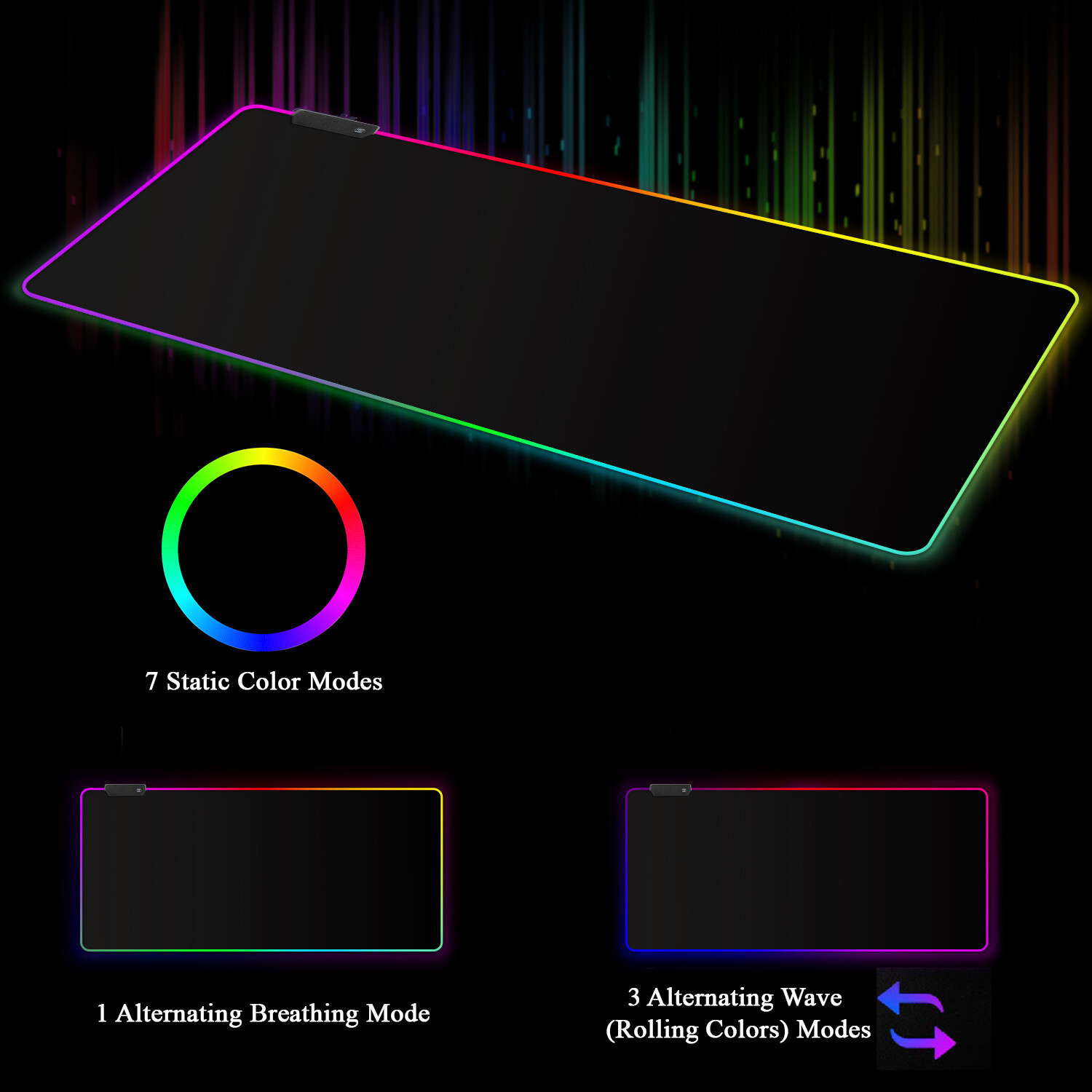 Our store Feedback Add To Favorite RGB Gaming Mouse Pad - Large LED Gaming Mouse Mat with Custom Design Stitched Edges (31.5 x 11.8 Inch) Specifications: RGB LED LIGHTING DESIGN - The RGB gaming extra-large mouse pad features 7 static color modes, 3 alternating wave modes and 1 alternating breathing mode PLUG AND PLAY WITH EXTRA LONG WIRE – 10 feet (3 meter) removable USB wire provide convenience. Easy plug and play. Set up with mode switch button DURABLE QUALITY & UNIQUE DESIGN – Made with high quality soft and durable material with unique vibrant colorful printing NO SKIPPING & SKIDDING - High quality cloth surface provides smooth and precise gliding, Thick and rubberized base keeps mouse pad in place EXTRA LARGE SIZE DIMENSIONS - 31.5 inch (800 mm) x 11.8 inch (300 mm) will fit your desktop perfectly and provide extra-large movement space All orders are shipped within 1 business day of payment, excluding Sunday and Holidays. FREE tracking for US Domestic package. We accept payments via Paypal and Credit Cards. We are required to collect sale tax for all the shipment to New York. We are a trusted eBay seller and fully committed to ensuring that you have a positive experience when purchasing from us. If you have any questions regarding your order or if you experience any issues, please fell free to contact us.
