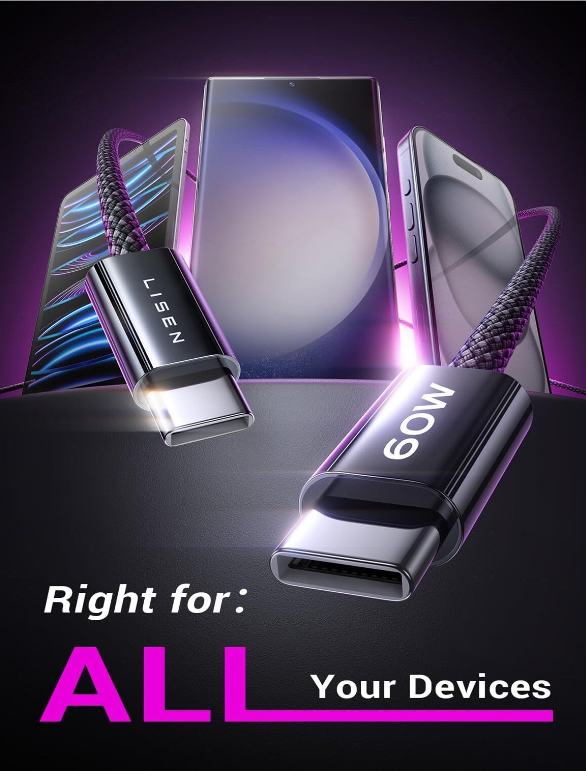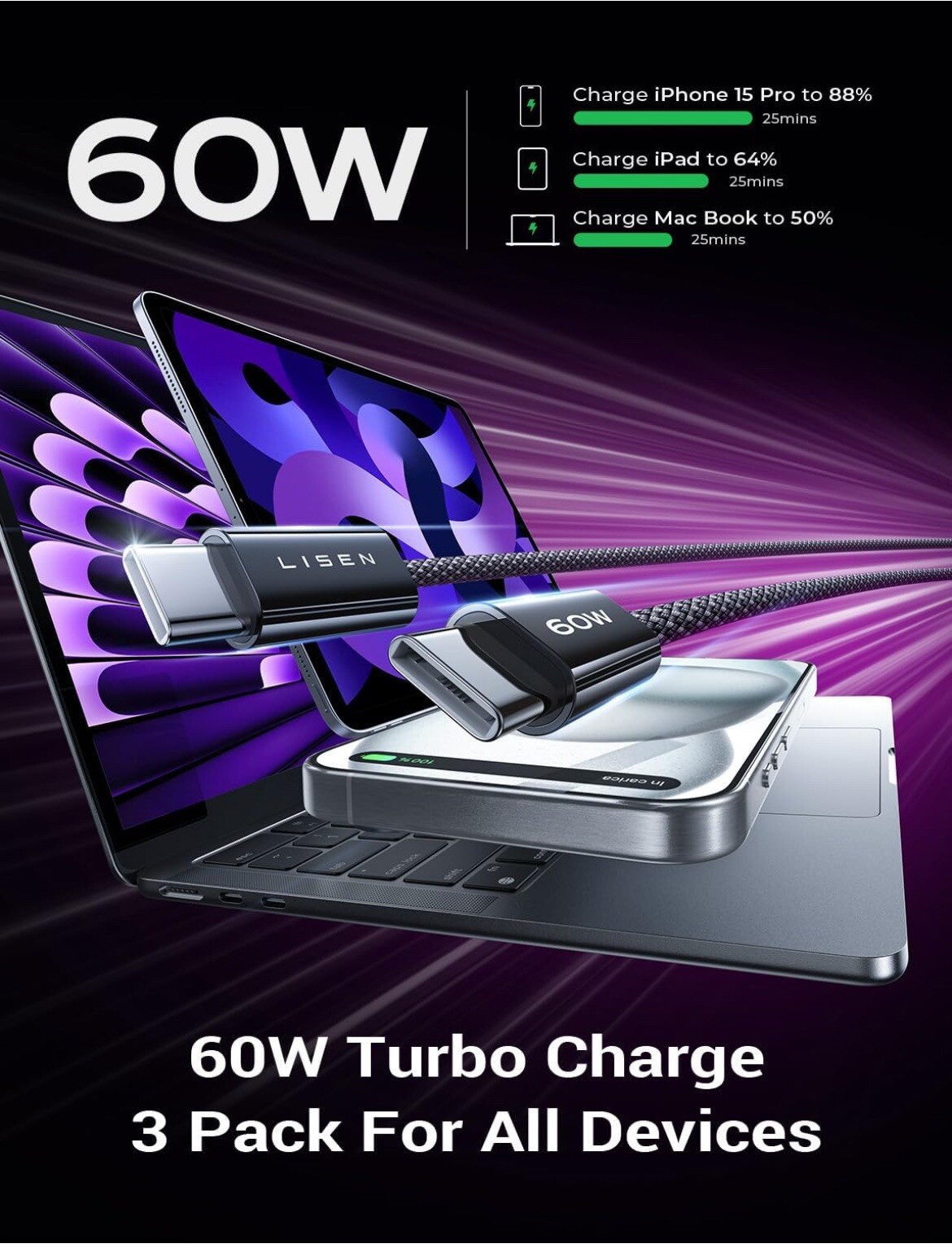 The LISEN USB-C to USB-C Cable 3-Pack is a must-have for anyone who wants to experience high-speed charging and data transfer. This amazing cable is designed with 48 strands of braided wire, making it durable and long-lasting. With a 60W 3.1A charging speed, this cable is perfect for charging your devices quickly and efficiently. The USB-C to USB-C connection ensures a secure and stable connection between your devices. Whether you're using it to charge your phone or transfer data between your laptop and other devices, this cable is sure to exceed your expectations. Don't miss out on the amazing features of the LISEN USB-C to USB-C Cable 3-Pack.