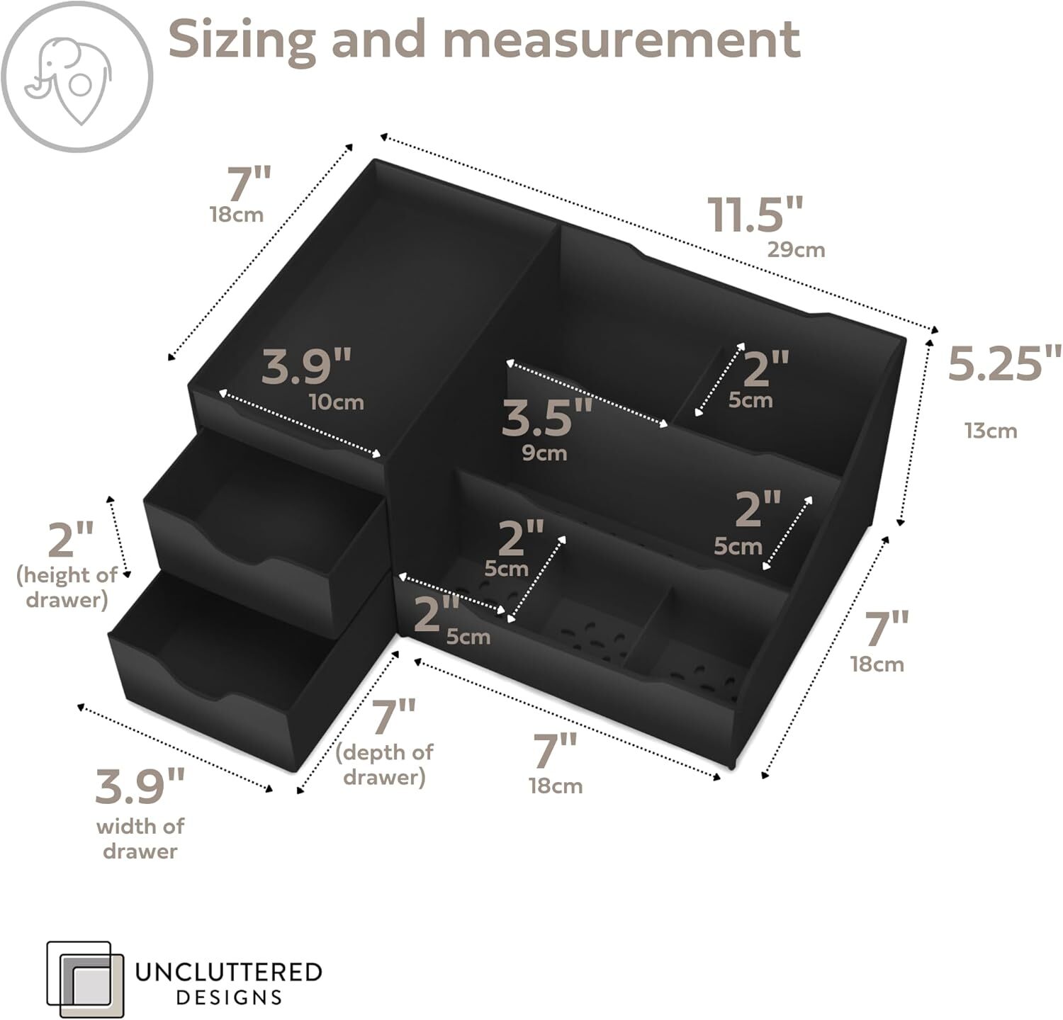 Free eBay listing template designed by dewiso.com Uncluttered Designs Large Black Vanity Organizer - Countertop Mens Organizer With Drawers for Cologne, Deodorant, Beard, Shaving Lotion, Perfume & Skincare - Perfect for Bathroom & Bedroom Storage FREE AND FAST SHIPPING! About this item LARGE CAPACITY CLUTTER FREE STORAGE - Seamlessly blending elegance and functionality, our large capacity organizer is designed for everyday use. Offering versatile storage for makeup, vanity essentials, office supplies & kitchen items. Ensuring a clutter-free space with multiple compartments & drawers. EXTRA DEEP DRAWERS FOR AMPLE STORAGE - Featuring 7 spacious compartments & 2 extra deep drawers, our versatile organizer will store a variety of items from lotions, makeup brushes, lipsticks to office supplies and kitchen essentials. HIGH-QUALITY MATERIALS - Our cosmetic storage box is made of high-grade, non toxic & odorless plastic, ensuring you can safely store delicate cosmetics & skin care products. EASY CLEAN WATERPROOF & WASHABLE - Completely waterproof and washable, our organizer offers superior drainage, making it ideal for skincare, beauty, toiletry & lotion products and other items that could cause a mess. Making clean up any spills easy! IDEAL GIFT - Our beauty organizer is the perfect choice as a gift to hypebeast boyfriend, son, husband, dad, and friends. Ideal gift for home warming, college dorm room essentials for men, Valentine's day, father’s day, thanksgiving day, christmas, birthday and wedding. › Product We offer a 30-Day Return Policy on items which you are not completely satisfied with. You have the option for a full-refund or an exchange of the item. No returns are available on items shipped outside of the US . Shipping We offer Free Shipping to the US and ship within 2 business days of payment, usually sooner. We use UPS express shipping. That's why your products are usually delivered within 3 days . Contact We try our very best to make sure every customer is completely satisfied. If there's a problem , message us! We're happy to help. 24/7 live chat available.