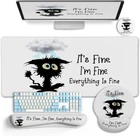 This desk mat set is a game-changer for both work and play! The playful black cat design with the "I'm fine" text adds a fun touch to my workspace. The large surface fits my keyboard and mouse perfectly, while the cushioned wrist rest keeps me comfortable during long hours. The included coaster is a nice bonus. The materials feel durable, and the non-slip base stays put. It's practical, stylish, and brings personality to my desk—great for gaming or office use. Definitely worth it!