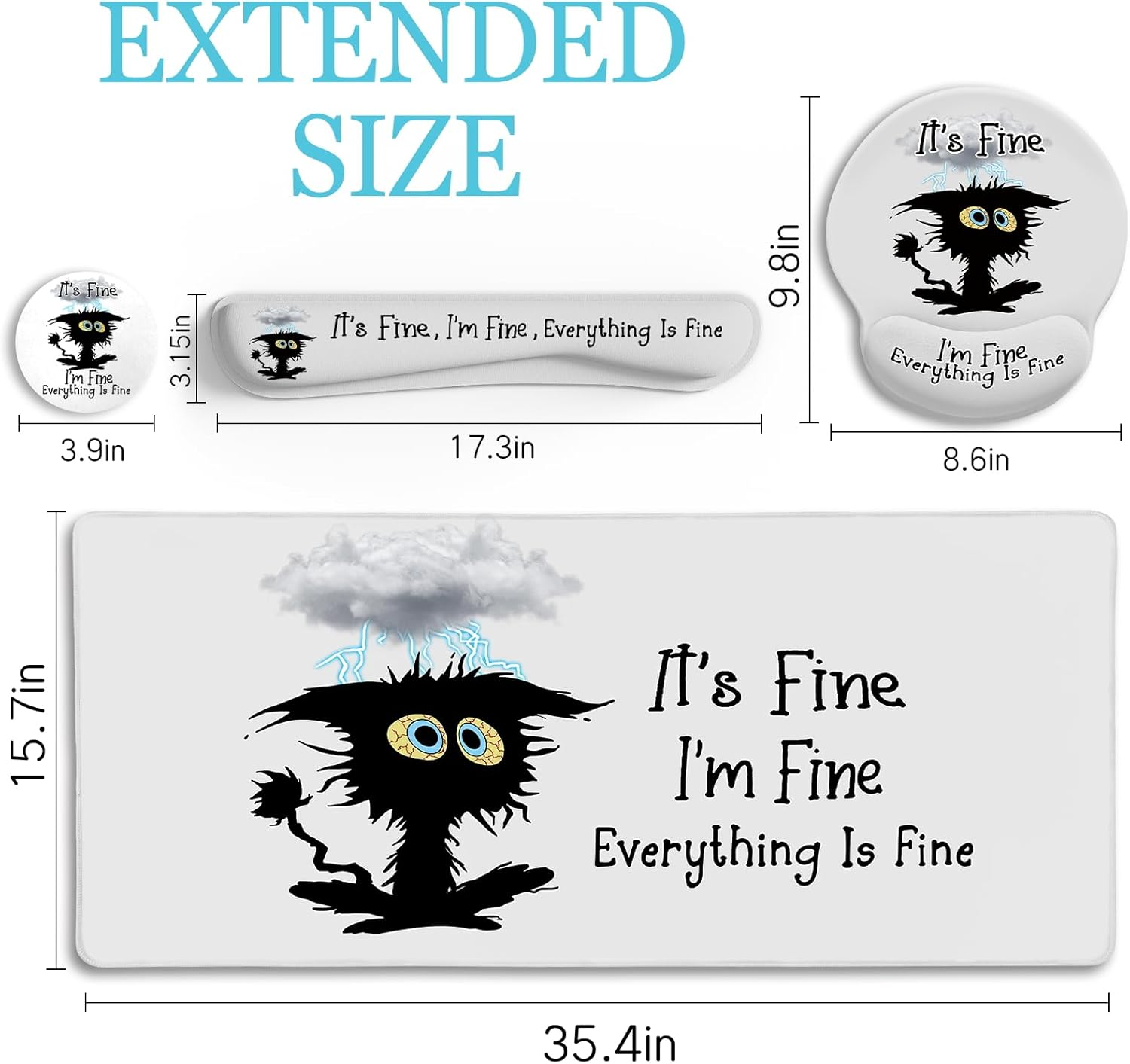 【Novelty design】Large mouse pad has clear patterns and unique styles. The funny design is for funny black cat, with funny words: It`s fine, I`m fine, everything is fine. They are an excellent office desk accessory and a good companion for learning, working and playing games, which adds more personality to your office! 【Funny Mouse Pad Set】The cat mouse pad set includes large desk mat (35.4×15.7inch), Mouse pad with wrist rest(9.8 x 8.6inch), Keyboard wrist rest (17.3 x 3.15inch), Cup Coaster (3.9" x 3.9"). The extended desk pad fits almost full-size keyboards and mice, providing plenty of space for gaming or office work! 【Ergonomic Design】Our black cat mouse pad set includes an ergonomic mouse pad with wrist support and a keyboard wrist support, which can provides a good touch and effective support for your wrist. Ideal for people who need to use a computer for long periods of time for office work or gaming. 【Ultra-smooth Surface】The Extended Large Desk Pad is made of high quality lycra surface. The non-slip base provides a stable surface for you to move your mouse accurately. It is worth mentioning that our mouse pad is surfaced with a water-resistant coating that makes it easy to clean any dirt. 【Amazing Gifts】The mouse pad set has multiple uses and you can use it in any way you want. The funny designs will make your workspace more beautiful while keeping your desk tidy! It also makes a great gift for Teacher's Day, Valentine's Day, Mother's Day, Father's Day, Christmas, birthdays and Thanksgiving. Product Description Funny Black Cat Desk Mat Desk Pad Black Cat Keyboard Mat Funny Ergonomic Mouse Pad With Wrist Rest Set Black Cat Cup Coaster Ergonomic Mouse Pad Desk Accessories Funny Home Office Desk Accessories Large Mouse Pad Set Desk Mat Pad for Desk Add to Cart Add to Cart Add to Cart Add to Cart Add to Cart Add to Cart Add to Cart Customer Reviews 4.8 out of 5 stars 305 4.8 out of 5 stars 305 4.8 out of 5 stars 305 4.8 out of 5 stars 305 4.8 out of 5 stars 305 4.8 out of 5 stars 305 4.8 out of 5 stars 305 Price $24.99 $ 24 . 99 $24.99 $ 24 . 99 $24.99 $ 24 . 99 $25.99 $ 25 . 99 $26.99 $ 26 . 99 $25.99 $ 25 . 99 $26.99 $ 26 . 99 Non-slip ✔ ✔ ✔ ✔ ✔ ✔ ✔ Ergonomic ✔ ✔ ✔ ✔ ✔ ✔ ✔ Gel Wrist Support ✔ ✔ ✔ ✔ ✔ ✔ ✔ Style Funny Cute Funny Anime Abstract Positively Funny Desk Pad Size 90x40cm 90x40cm 90x40cm 90x40cm 90x40cm 90x40cm 90x40cm Keyboard Wrist Rest memory Foam memory Foam memory Foam memory Foam memory Foam memory Foam memory Foam Funny Ergonomic Mouse Pad with Wrist Rest Add to Cart Add to Cart Add to Cart Add to Cart Add to Cart Add to Cart Add to Cart Customer Reviews 4.8 out of 5 stars 280 4.8 out of 5 stars 280 4.8 out of 5 stars 280 4.8 out of 5 stars 280 4.8 out of 5 stars 280 4.8 out of 5 stars 280 4.8 out of 5 stars 280 Price $9.99 $ 9 . 99 $9.99 $ 9 . 99 $12.99 $ 12 . 99 $11.99 $ 11 . 99 $12.99 $ 12 . 99 $12.99 $ 12 . 99 $12.99 $ 12 . 99 Non-slip ✔ ✔ ✔ ✔ ✔ ✔ ✔ Ergonomic ✔ ✔ ✔ ✔ ✔ ✔ ✔ Smooth ✔ ✔ ✔ ✔ ✔ ✔ ✔ Gel Wrist Support ✔ ✔ ✔ ✔ ✔ ✔ ✔ Surface Lycra Lycra Lycra Lycra Lycra Lycra Lycra Theme It's fine, I'm Fine Cat Flower Black Cat Three Black Cat Pink Elephant Everything is Fine Dog As Far As I Know Black Cat