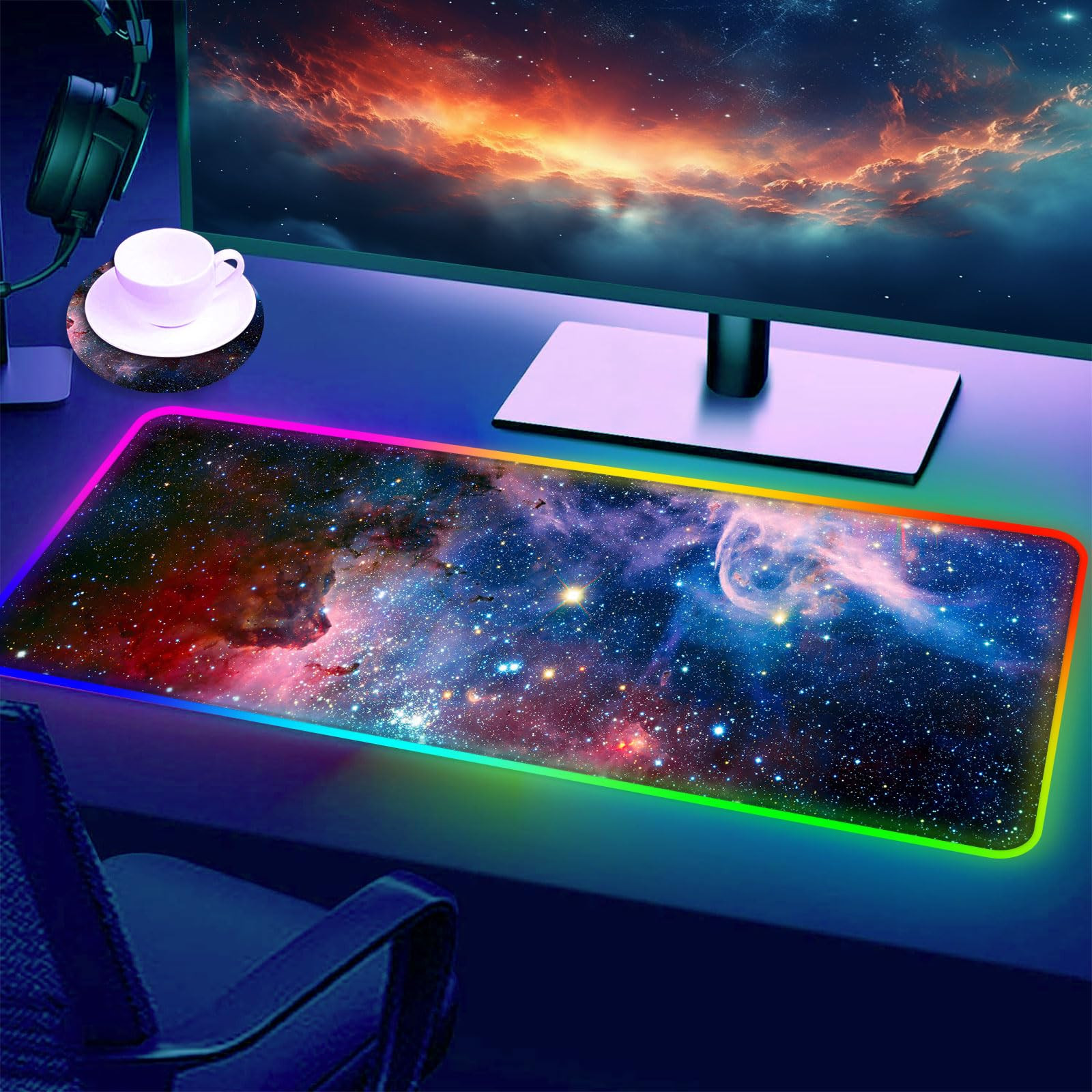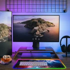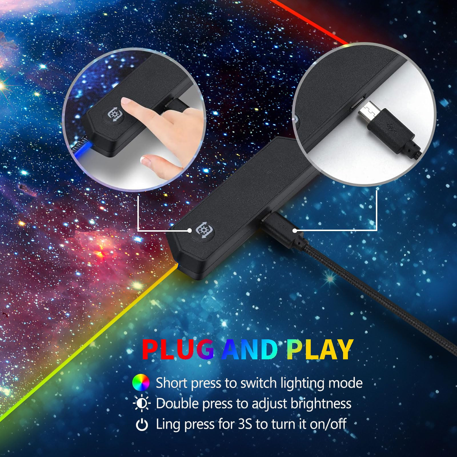 RGB Gaming Mouse Pad is Ideal for Gaming or Office Work, Comfortable and Durable, to Provide You with the Perfect Using Experience. Large Size Design Extended size 800x300x3mm(31.5x11.8x0.16inch),you’ll never worry about your mouse running off the edge of the pad and disrupting your game play at the most crucial moment. It also provides a larger usable area to cover keyboard,mouse and stuff on the desk when playing games. Convenient Washable Design Designed for optimum performance and with stitched edges to protect against fraying, this highly functional mouse pad keeps a low profile on your desk. The pad is also easy to keep looking like new because it's made of fine-textured, water-resistant fabric and high-density rubber that you can wash without worry. Ideal Gift for Your Family and Friends With high quality and high end design, this mouse pad is an Ideal gift for any men, women, children, teens, gamer fans, friends, family, staff on Thanksgiving, Christmas, New Year and other holidays. Specifications Model: RGB Gaming Mouse Pad Material: Natural rubber Dimensions: 800x300x3mm(31.5x11.8x0.16inch) NOTE: If you want to put away the mat, please do not to fold it into two. Otherwise the luminescent fiber will be damaged. We suggest to roll it up and put it in the storage bag. NOTE: Due to rolling up for a long time in the package, if it's not flat, we suggest to put it be flat under heavy things for about 24H will be ok. Package Include: 1×RGB Mouse Pads 1 x USB charging cable Large gaming mouse pad design (31.5x11.8x0.12 inches/800mm*300mm*3mm) makes it provide larger area fits both for keyboard and mouse. Includes 7 Monochromatic Light, 1 Gradual change mode, 1 flashing mode ,1 Colorful breathing circulation (red, green, blue, purple, green, yellow and white). Press and hold for 3 seconds to turn off in any mode, and then press again to turn on(Memory function when power off) This extended mouse pad is powered by USB, plug and play, no driver required.The control button of this mouse pad has been tested for 10 million times and is extremely durable. Just press it to choose the lighting mode you want. Made of high elasticity natural rubber, this mouse mat is non-toxic and has no hazardous substances, safe for use. Anti-slip base can firmly grip your desktop and nylon stitched edges make the pad much more durable and longer lasting. Easily roll up the mouse pad without getting wrinkless or creases. Non-slip rubber base, 2M braided USB cable and durable construction, large size providing enough space for mouse movement during gaming.