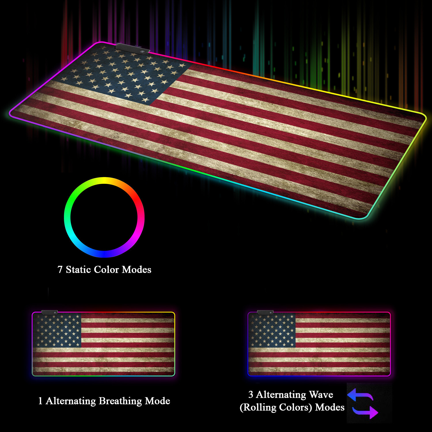 Our store Feedback Add To Favorite RGB Gaming Mouse Pad - Large LED Gaming Mouse Mat with Custom Design Stitched Edges (31.5 x 11.8 Inch) Specifications: RGB LED LIGHTING DESIGN - The RGB gaming extra-large mouse pad features 7 static color modes, 3 alternating wave modes and 1 alternating breathing mode PLUG AND PLAY WITH EXTRA LONG WIRE – 10 feet (3 meter) removable USB wire provide convenience. Easy plug and play. Set up with mode switch button DURABLE QUALITY & UNIQUE DESIGN – Made with high quality soft and durable material with unique vibrant colorful printing NO SKIPPING & SKIDDING - High quality cloth surface provides smooth and precise gliding, Thick and rubberized base keeps mouse pad in place EXTRA LARGE SIZE DIMENSIONS - 31.5 inch (800 mm) x 11.8 inch (300 mm) will fit your desktop perfectly and provide extra-large movement space All orders are shipped within 1 business day of payment, excluding Sunday and Holidays. FREE tracking for US Domestic package. We accept payments via Paypal and Credit Cards. We are required to collect sale tax for all the shipment to New York. We are a trusted eBay seller and fully committed to ensuring that you have a positive experience when purchasing from us. If you have any questions regarding your order or if you experience any issues, please fell free to contact us.