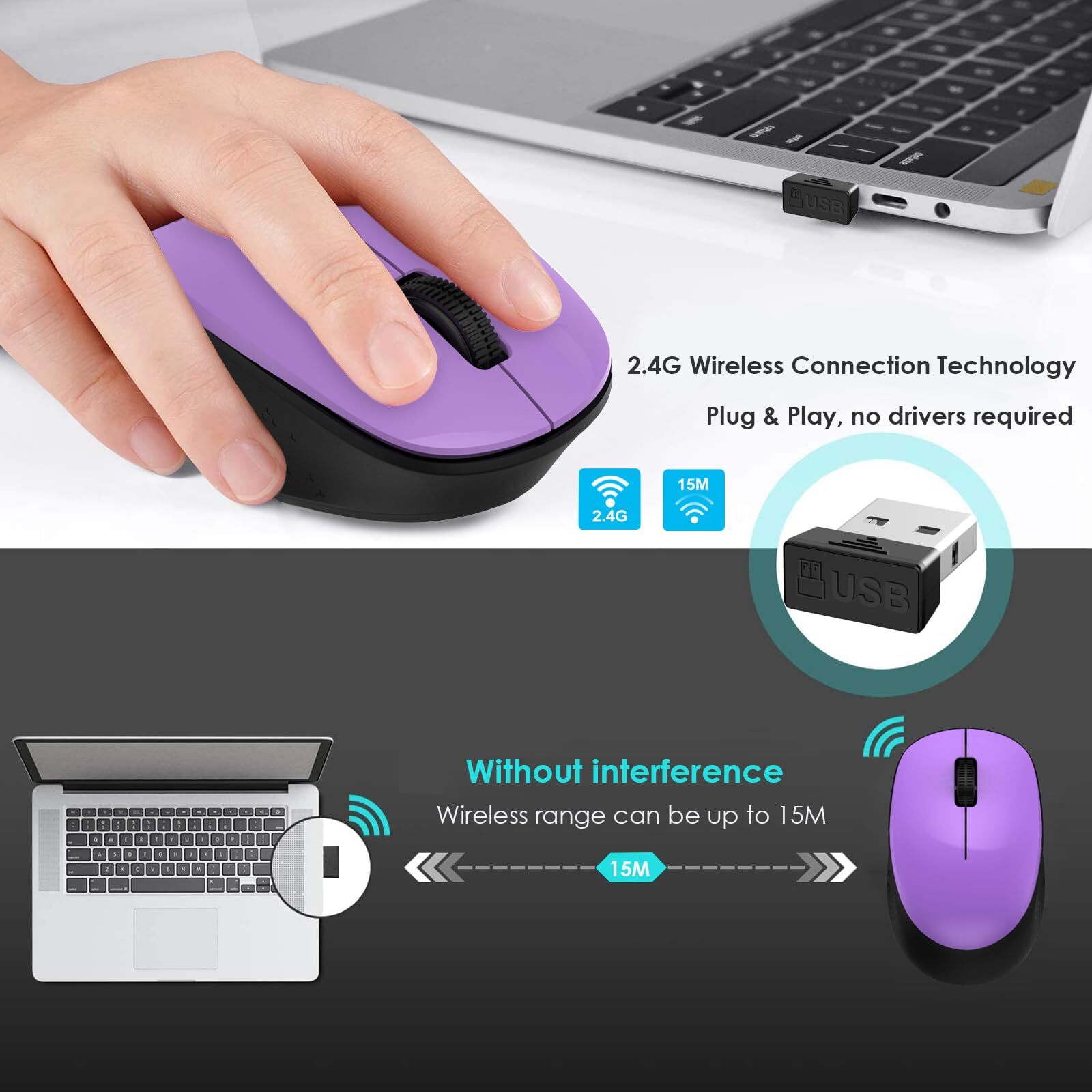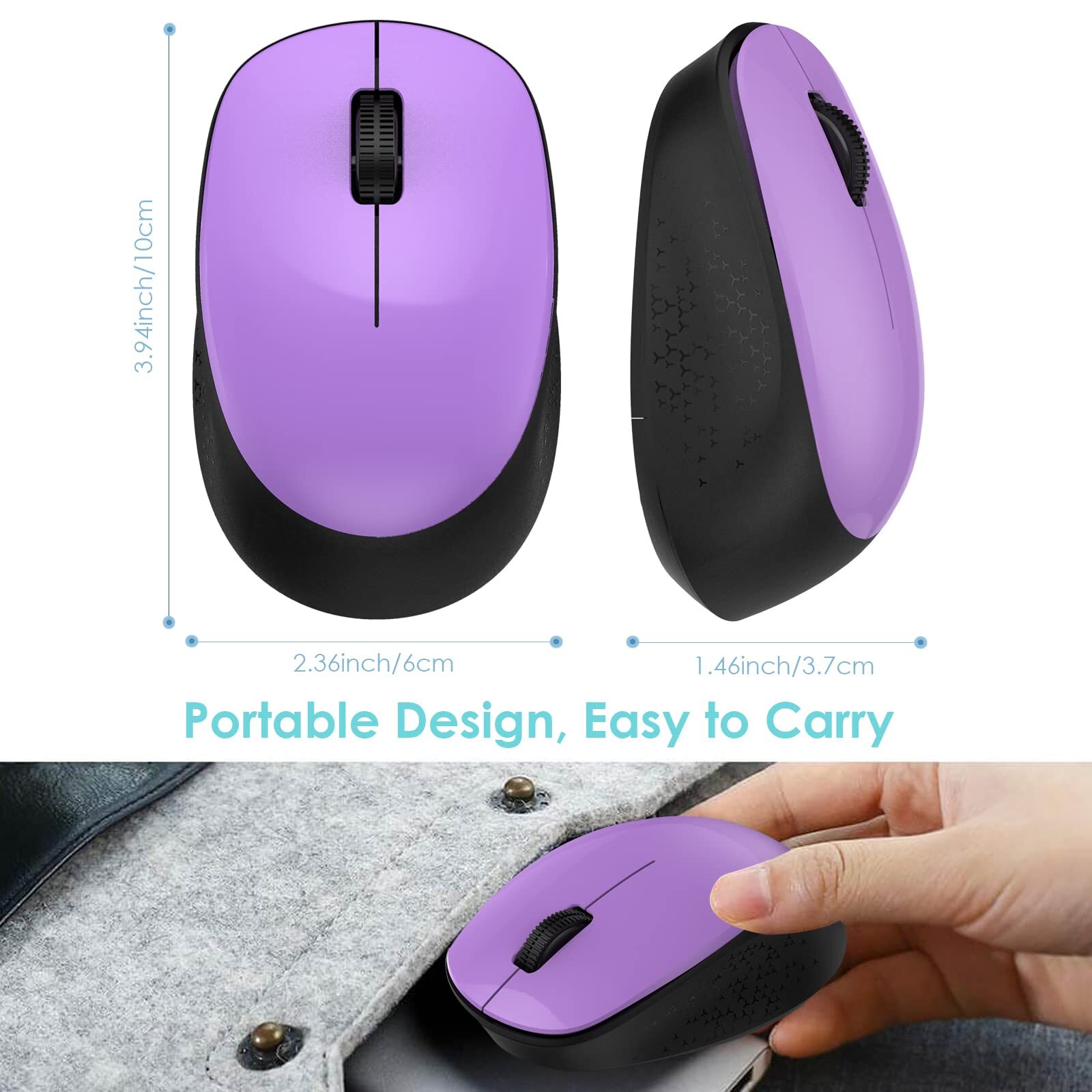 LeadsaiL Wireless Mouse for Laptop, 2.4GHz Silent USB Mouse, Slim Optical Mouse with 3 Buttons, 1600 DPI, Works with Windows, Mac, Chrome OS, Linux - Black and Purple 【Silent Click Noiseless Mouse】 【2.4G USB mouse,Plug & Play Simplicity】 【High Precision LED Mouse】 【Portable Slim Mini Mouse】 【Energy Saving Mobile Mouse】 【Silent Click Noiseless Mouse】Would you like to do your job without missing a sound or disturbing your environment? Choose LeadsaiL quiet mice; you will enjoy the same click feeling with over 90% less click noise. 【High Precision LED Mouse】Would like to take full control of your every aim with perfect tracking? Choose LeadsaiL optical LED wireless mouse. Featuring a 1600 DPI, the laser-grade engine ensures smooth cursor control and precision tracking on virtually any surface. 【Plug and Play Travel Mouse】Plug and go ready along with the Nano Receiver stored in the battery compartment, LeadsaiL USB wireless travel mouse works with Windows, Mac, Chrome OS or Linux-based computers of Notebook, PC, Laptop, Computer, Macbook. 【Portable Slim Mini Mouse】The slim mini mouse adopts shapely, domed design for giving your palm plenty of support and seamlessly fits in your hand, so you can work or play comfortably for long hours. 【Energy Saving Mobile Mouse】LeadsaiL mobile mouse keeps going with months battery life of power on a single AA battery(Not included in the package). Automatic sleep mode and an On/Off switch save power, (Battery life may vary based on use and computing conditions.) Shipping from the USA All of our products are shipped from the USA, ensuring quick delivery to your destination. Payment We offer the following payment methods: PayPal, credit card, bank transfer, and eBay's secure payment system. Free Shipping & Free Returns Shipping within the USA is FREE. Additionally, any return is absolutely free for you. Risk-Free Purchase You have the option to return an item within 30 days without any justification. We cover the return shipping costs! Fast Shipping We ship immediately upon receipt of payment. Generally, the package is delivered within 2-3 days in the USA. If it takes longer, we will contact you. Quality and Costs Made in Europe, USA, China No customs fees or additional charges Total satisfaction guarantee Invoice with declared VAT available upon request in .pdf format Feedback Your feedback is very important to us. After you pay for your purchase, you will automatically receive positive feedback from us.