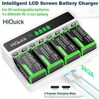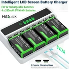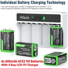 About this 4pcs 9V Lithium Rechargeable Batteries High Performance 9V Lithium Batteries : 280mAh/ 600mAh large capacity 9 volt li-ion rechargeable batteries lasting longer than alkaline or nimh 9v batteries. good choice for smoke alarm detector Low Self-discharge for Storage : HiQuick's low self-discharge rate makes the 9-volt lithium batteries storage a long time when no use, so even if you aren’t used as frequently, it also can keep the performance. Safer and Reliable: HiQuick 9 volt lithium batteries with overcharge, over-discharge, over-current and short circuit protection. Ensure the safety for you and your 9V device. Without Memory Effect: HiQuick 9 volt lithium batteries have no memory effect, keep the performance of the batteries like New. Widely Application: HiQuick 9 volt rechargeable batteries could work well with a variety of devices, such as wireless microphone, smoke/fire alarms, remote controller detector, speaker, LED lighting devices and so on. About this 4 Bay LCD 9V Charger Independent charging slot charger : 4 slots are convenient for charging 1 to 4 NiMH/NiCD/Li-ion 9 volt rechargeable batteries, can charge different battery types at once, and can also realize single one charging. Fast charging speed: DC 5V 2A input, which could charge the battery number of 1 to 4pcs of 9 volt batteries with high current. Fully charge your battery faster and provide sufficient power to your device as soon as possible. Powerful repair function: This charger can repair the battery voltage to effectively improving the battery's durability, If your battery voltage is in the low voltage range of 0-0.9. Powerful protection: The charger is designed with a microcomputer chip, which can control the charging time and automatically cut off the charging current when batteries are fully charged. In addition, it can effectively prevent excessive current, excessive voltage, excessive temperature and short circuit. Smart LCD screen and two charging ways: The LCD screen is clear and easy to read, which make the charging process visualizer.Type c and micro usb provide you two charging ways. You can just connect with power outlet, desktop, car charger or power bank when charging your batteries. Battery Charger Specifications Input: Micro USB /Type C DC 5V/2A Output: DC 8.4V 260mA for 9V Li-ion DC 9V 80mA for 9V Ni-MH/CD:DC 9V 80mA Charging Way: Constant voltage and current control Size & Weight Size: 81mm*121mm*27.5mm Weight: 90g (No batteries included) Product Description HiQuick 9V Rechargeable Battery Charger for NiMH/NiCD/Li-ion with Independent Slots&LCD Screen Micro USB Input 4 Slots Charger for PP3 Battery Q.Who is HiQuick? A: HiQuick is one of the leading battery and charger manufacturing companies that are engaged in AA, AAA, C, D, 9V, 18650 batteries and related battery chargers, it has more than 20 years of battery R&D and production history. Q.How about the HiQuick? A: HiQuick rechargeable batteries and battery charger are sold in many countries and are widely recognized for the high quality. Performance of HiQuick 9V Rechargeable Battery Charger Specifications Input: Micro USB /Type C DC 5V/2A Output: DC 8.4V 260mA for 9V Li-ion DC 9V 80mA for 9V Ni-MH/CD:DC 9V 80mA Charging Way: Constant voltage and current control Size & Weight Size: 81mm*121mm*27.5mm Weight: 90g (No batteries included) Charging Time Table 2 Li-ion batteries 2.5 hours 4 Li-ion batteries 5 hours 2 Ni-MH batteries 3 hours 4 Ni-MH batteries 6 hours All in One Independent slot charging technology allows you to charge 1-4 9V Ni-MH Ni-CD lithium-ion batteries in one charger. Multiple protection With overheat-detection to efectively prevent over-charging, over-charging, over voltage, over Heat, short circuit and reverse polarity. Widely usage Fast power 9V rechargeable batteries for smoke alarms, metal detectors, professional audio equipment, microphones, conference audio systems, etc. Package ► Micro USB Cable x 1 ► User Manual x 1 ► 4 Bay 9V Battery Charger x 1 On Jan 9, 2025 at 18:07:42 PST, seller added the following information: