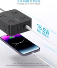 Long Extension Cord 15 ft, Surge Protector Power Strip 15 Feet 15Ft, Black Product Details Package Dimensions: 8.15 x 6.3 x 2.4 inches Item Weight: 1.42 pounds Manufacturer: HANYCONY Country of Origin: China Brand: HANYCONY Color: Black Total Power Outlets: 8 Voltage: 125 Volts Special Feature: Mountable 【12 IN 1 Power Strip with USB】- The 20 ft power strip surge protector with 8 AC widely outlets and 4 USB charging ports(Total 5V/3.1A) can power up to 12 devices simultaneously. It could charge your cellphone, laptop, tablet, cameras without a variety of converters, save your space and make your desktop organize, perfect suitable for your desktop or nightstand home, office, travel, college dorm room 【20 Ft Extension Cord with Flat Plug】- The low profile flat plug fits easily in tight spaces; and the right angle flat plug design prevents bottom plug blocking; the 15 Ft braided extension cord is made of pure copper, which has better current carrying capacity (15A), is not easy to deform, durable and more safety; the two mounting holes on back allows this power strip to be securely installed in various applications 【2 x USB C Power Strip】- Added extra 2 USB C ports for your devices, the USB C port can charge up to 5V/3A. USB-A ports can charge up to 5V/2.4A Max, all USB Ports Output is 5V/3.1A, 15.5W max which is 30% faster than other usb c charging station. With smart charging technology, it can auto-detects your devices and can reach faster charging efficiency, perfectly fit for your iphone, ipad, tablet etc 【2.2 IN Wide Space】- The desk power strip with 3-side design that makes it easier to make the plugs not covering any outlet, the 8 AC outlets with 2.2 IN widely spaced in between outlets, larger than standard socket, fit big adapters without blocking each other. The compact design saves more space, suitable for the home, office, and college dorm room 【Overload Surge Protection】- The power surge protector with overload protection protects your electrical appliances from lighting, surges or spikes. The minimum energy-absorbing capacity of 1080 Joules. Lighted on/off switch with integrated circuit breaker for overload protection of all outlets.(The "Surge Protected” indicator light on to show your devices are protected)