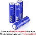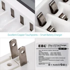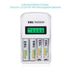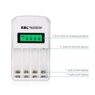 For Battery Descriptions * This is 4 in 1 EBL AA AAA rechargeable NI-MH rechargeable battery, up to 1000 recharge times. Durable for high power demend devices such as Digital Cameras, CD Players, Remote Control Vehicles, Metal Detectors, Pocket Flashlights, PDAs Palm Pilots, Pagers, Game Boys, Children's Toys, etc Features * 100% Brand new and high quality * It is 4 in 1 EBL AA AAA rechargeable NI-MH replacement battery * The latest lock electric technology are adopted * Nimh environmental protection material * Rechargeable battery, up to 1000 recharge cycles * Excellent high discharge/drain performance * Exact replacement for standard AA AAA size batteries * Superior performance under low temperature condition * Longer in high drain devices than Alkaline batteries * Can be commonly usedd for for high power demend devices such as Digital Cameras, CD Players, Remote Control Vehicles, Metal Detectors, PocketFlashlights, PDAs Palm Pilots, Pagers, Game Boys, Children's Toys, etc * Each 4 batteries come with 1 case box Specification AAA Rechargeable Battery * Capacity: 800/1100mAh * Voltage: 1.2V * Battery type: AAA R03 * Chemical Composition: Ni-MH * Total Weight: 60g * Quantity: 4/8/12/pcs AA Rechargeable Battery * Capacity: 2300/2800mAh * Voltage: 1.2V * Battery type: AA R6 * Chemical Composition: Ni-MH * Total Weight: 60g * Quantity: 4/8/12/pcs For Charger Features: Rechargeable Battery Charger The battery charger features individual charging status for each slot, it can freely charge 1,2,3,4 Ni-MH Ni-CD AA/AAA rechargeable batteries. The battery charger has smart LCD to show its charging progress separately, the battery icon stops flashing when battery is fully charged. With advanced MCU control and -∆V function, the charger has good protection from over-heat and over-current protection, short-circuit protection, non-rechargeable and defective battery detection. Trickle charging mode will help the battery charger maximize the capacity of battery to fully charged. Worldwide usage: 100-240V AC, 50/60 Hz. Specifications: Input: 100-240V AC, 50/60 Hz 500mA Max Output: 1x AA 1.2VDC 2000mA, 1x AAA 1.2VDC 1000mA; 2x AA 1.2VDC 1000mA, 2x AAA 1.2VDC 500mA; 3x AA 1.2VDC 500mA, 3x AAA 1.2VDC 250mA; 4x AA 1.2VDC 500mA, 4x AAA 1.2VDC 250mA; Environmental Condition Ideal charge environment temperature: 0℃ to 40℃, Humidity ≦ 80% Ideal storage environment temperature: -10℃ to 40℃, Humidity ≦ 60% Working temperature Surface temperature of charger ≦ 60℃ Surface temperature of battery ≦ 45℃ Package Includes As your choice