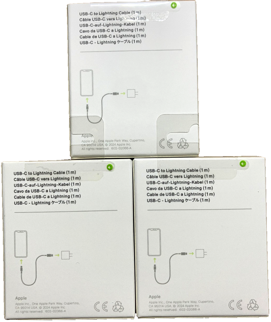 Apple USB-C To Lightning Cable (1M) Model # A1703 (Bulk Lot of 3 Cables) Compatibility: iPhone Models iPhone 14 Pro iPhone 14 Pro Max iPhone 14 iPhone 14 Plus iPhone 13 Pro iPhone 13 Pro Max iPhone 13 mini iPhone 13 iPhone SE (3rd generation) iPhone 12 Pro iPhone 12 Pro Max iPhone 12 mini iPhone 12 iPhone 11 Pro iPhone 11 Pro Max iPhone 11 iPhone SE (2nd generation) iPhone XS iPhone XS Max iPhone XR iPhone X iPhone 8 iPhone 8 Plus iPhone 7 iPhone 7 Plus iPhone 6s iPhone 6s Plus iPhone 6 iPhone 6 Plus iPhone SE (1st generation) iPhone 5s iPhone 5c iPhone 5 iPad Models iPad Pro 13-inch (M5) iPad Pro 13-inch (M4) iPad Pro 12.9-inch (6th generation) iPad Pro 12.9-inch (5th generation) iPad Pro 12.9-inch (4th generation) iPad Pro 12.9-inch (3rd generation) iPad Pro 12.9-inch (2nd generation) iPad Pro 12.9-inch (1st generation) iPad Pro 11-inch (M5) iPad Pro 11-inch (M4) iPad Pro 11-inch (4th generation) iPad Pro 11-inch (3rd generation) iPad Pro 11-inch (2nd generation) iPad Pro 11-inch (1st generation) iPad Pro 10.5-inch iPad Pro 9.7-inch iPad Air 13-inch (M3) iPad Air 11-inch (M3) iPad Air 13-inch (M2) iPad Air 11-inch (M2) iPad Air (5th generation) iPad Air (4th generation) iPad Air (3rd generation) iPad Air 2 iPad Air (1st generation) iPad (A16) iPad (10th generation) iPad (9th generation) iPad (8th generation) iPad (7th generation) iPad (6th generation) iPad (5th generation) iPad mini (A17 Pro) iPad mini (6th generation) iPad mini (5th generation) iPad mini 4 iPad mini 3 iPad mini 2 iPad mini (1st generation) Mac Models MacBook Air (13-inch, M4, 2025) MacBook Air (15-inch, M4, 2025) MacBook Air (13-inch, M3, 2024) MacBook Air (15-inch, M3, 2024) MacBook Air (15-inch, M2, 2023) MacBook Air (13-inch, M2, 2022) MacBook Air (M1, 2020) MacBook Air (Retina, 13‑inch, 2020) MacBook Air (Retina, 13-inch, 2018–2019) MacBook Pro (14-inch, M5) MacBook Pro (14‑inch, 2024) MacBook Pro (16‑inch, 2024) MacBook Pro (14‑inch, 2023) MacBook Pro (16‑inch, 2023) MacBook Pro (13‑inch, M2, 2022) MacBook Pro (14‑inch, 2021) MacBook Pro (16-inch, 2021) MacBook Pro (16-inch, 2019) MacBook Pro (13-inch, M1, 2020) MacBook Pro (13-inch, 2020) iMac (24‑inch, M4, 2024) iMac (24-inch, M3, 2023) iMac (24-inch, M1, 2021) iMac (Retina 4K, 21.5‑inch, 2019) iMac (Retina 5K, 27-inch, 2019–2020) iMac Pro (2017) Mac Studio (2025) Mac Studio (2023) Mac Studio (2022) Mac mini (2024) Mac mini (2023) Mac mini (M1, 2020) Mac mini (2018) Mac Pro (2023) Mac Pro (2019) iPod Models iPod touch (7th generation) iPod touch (6th generation) iPod touch (5th generation) iPod nano (7th generation) AirPods Models AirPods Pro 2 with MagSafe Charging Case (Lightning) AirPods Pro (1st generation) with MagSafe Lightning Charging Case AirPods (3rd generation) with MagSafe Charging Case AirPods (3rd generation) with Lightning Charging Case AirPods with Wireless Charging Case (2nd generation) AirPods (2nd generation) AirPods Max (Lightning Connector) AirPods (1st generation)