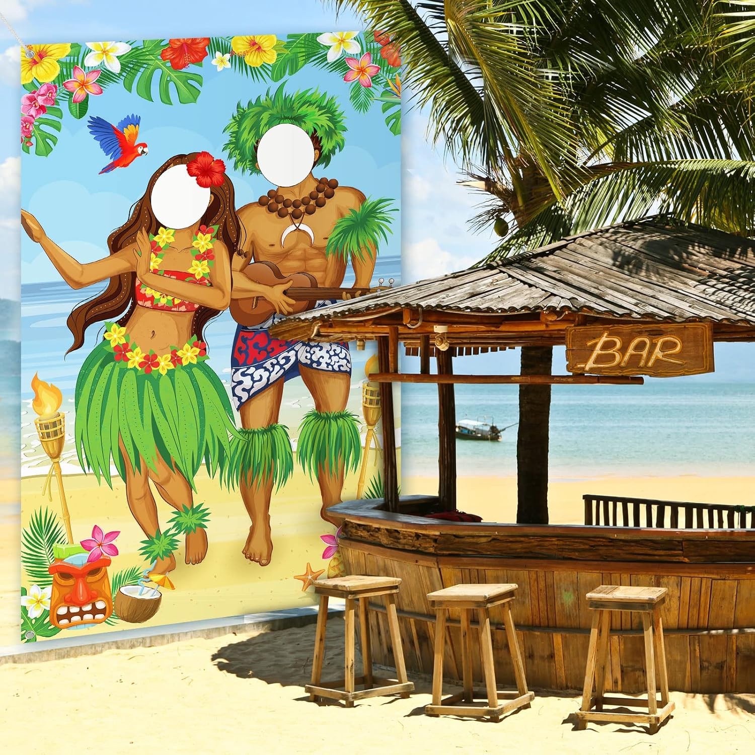 Frienda Luau Couple Photo Door Banner Hawaiian Party Decorations Tiki Luau Phot Luau Couple Door Banner: the package contains 1 luau photo props measuring about 180 x 110 cm/ 6 x 3.6 ft, and 1 white rope to hang the luau couple banner, the luau couple photo door banner is big enough to meet your demand, suitable for kids and adults photoing, easy to hang it and take luau photo on the luau party,nice and beautiful luau photo props. Tiki Banner Design: the hawaiian photo prop is designed for tiki party, luau party, summer party, Hawaiian party, tropical party, aloha party, including many luau theme elements, such as hibiscus flowers, different tiki pattern, aloha torch, sun, suitable for party, forest night party and so on, nice tiki banner decorations Hawaiian Luau Backdrop Application: our luau hawaiian party banner is practical and decorative, suitable for Hawaii party decorations, summer pool party, luau party, aloha party, tropical beach party, summer party and so on,nice hawaiian decorations for party. Quality Material: our luau party background is made of quality fabric, light in weight, reusable, washable, tear resistant and can be applied as outdoor luau party decorations , indoor tiki party decorations, hawaiian party decorations. Easy to Assemble the Tiki Luau Photography: there is a hole on the 2 corners of the tiki backdrop, you can use the rope to pass through the hole, and then hang the luau background in various places, such as wall, door, window and more, easy to use on your aloha party, it is a nice summer luau party decoration, adding a touch for your tiki aloha party