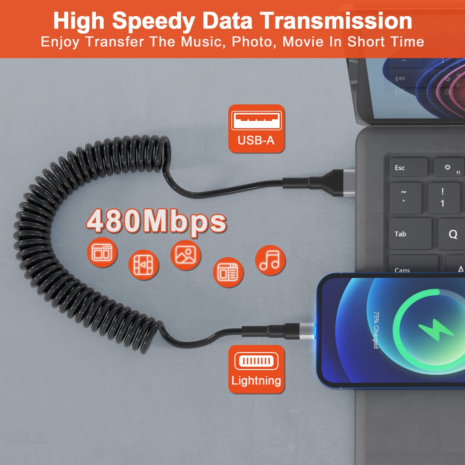 【Support Apple CarPlay】This apple carplay cable has a great solution for charging your phone in the car and supports Apple CarPlay. Retractable iPhone car charger with spring shape design, portable and not tangled. Besides, coiled lightning cable can save your space in the car and say goodbye to the hassle of charge cable clutter. 【Fast Charger & Data Sync】This coiled short iphone charging cable meets all Apple standards with transfer speeds up to 2.4A fast charging and 480Mbps. Allowing you to charge your iPhone 14/13/12, 0 to 40% in 30mins or 75% in 1hr. Best for pairing with car charger. 【MFi Certified & CarPlay Compatible】Fully support CarPlay. Our officially MFi certified coiled apple carplay cable can secure a reliable & firm connection. Get directions, answer calls, reply to messages all with this short iphone charging cable. 【With LED Light & Wide Compatibility】The MFi certified lightning cable adopts the original Apple chipset to maintain safe and stable charging without error message pop up when the USB A Port is connected to power supply, compatible with all iPhone models, such as iPhone 14, iPhone 13, iPhone 12, iPhone X. Also compatible with i Pad and Air Pods. 【Best Service For the Apple CarPlay cord】For the Coiled Lightning Cable, iPhone car charger cable (USB-A to Lightning Cable), we provide the 24 hours email support, 30-day free return and exchange service, and 1 years of after-sales warranty.If you have any questions about your product, please contact us, we will reply as soon as possible.