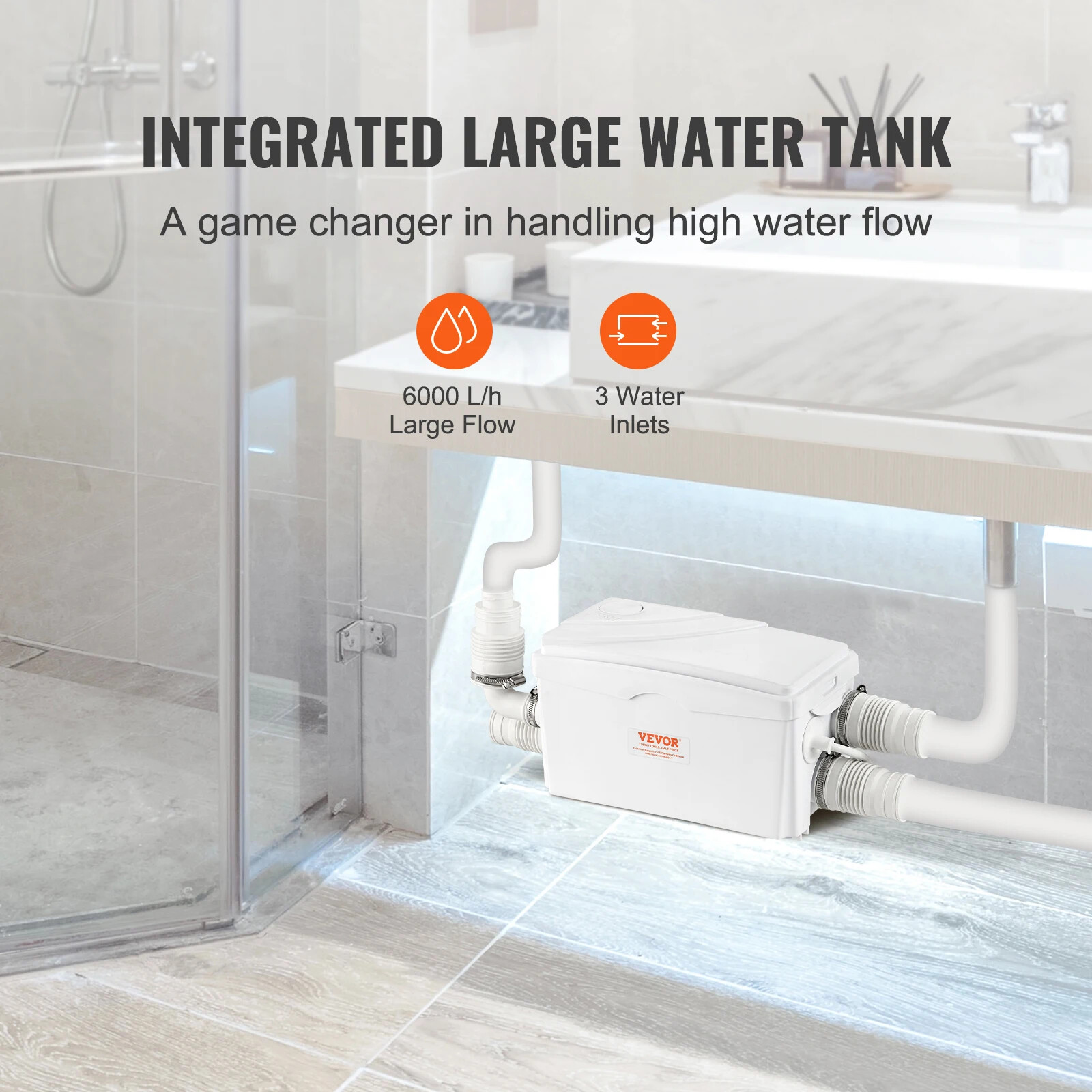 Flush All the Waste Away with Its Strong Power Looking for ways to easily and quickly dispose of wastewater? This VEVOR macerator pump provides a 23 ft high head and 6000 L/h large flow with a powerful 350W copper motor. Whether you're adding it to your bathtub, shower room, laundry, or kitchen, this sewerage pump is the one you can trust. Our macerator sewerage sump pump can better adapt to hot water applications with the oil injection design. It also improves the service life of the motor. The upflush pump has 3 water inlets connecting various devices in your bathroom or kitchen simultaneously. You can get convenient and cost-saving water disposal. Our sewer macerator pump features an antimicrobic silver ion tank with an inhibition rate of up to 99%. So you don't have to worry about odors. This macerator sewerage pump has an elbow assembly with a check valve to connect the water outlet. It helps you easily solve the problem of wastewater backflow. Features & Details 【Powerful Macerator Pump】: The sewerage pump has a 350W copper motor for better performance and extended service life. The 23 ft max head and 6000 L/h max flow make it perfect for your basement sewage treatment system. It collects, treats, and discharges sewage from bathrooms without the need for extensive renovation projects. 【Oiling to Withstand Hot Water】: The motor is injected with oil to protect itself and withstand continuous 75℃ water or 4-hour 90℃ water. Our macerating pump stands up to hotter water for a more extended time than anything on the market, making it more heat-resistant and durable. 【Effective Antimicrobic Property】: Don't worry about odors after prolonged use! A specially designed silver ion water tank has an inhibition rate of up to 99% and effectively prevents the generation of odors. This upflush pump is maintenance-free, allowing you to use it without a headache! 【Designed Just for You】: The macerator sewerage pump has four pads, reducing noise during operation to not affect your sleep. A built-in check valve prevents liquid backflow without needing an external check valve. It also features the latest sealing structure for better sealing performance. 【Perfect Fit for Multiple Spaces】: The VEVOR macerator sewerage sump pump has a compact structure, suitable for most shallow spaces. Three built-in water inlets provide sufficient capacity for various devices. It can be connected to the bathtub, shower, laundry, kitchen sink, or any other sink.