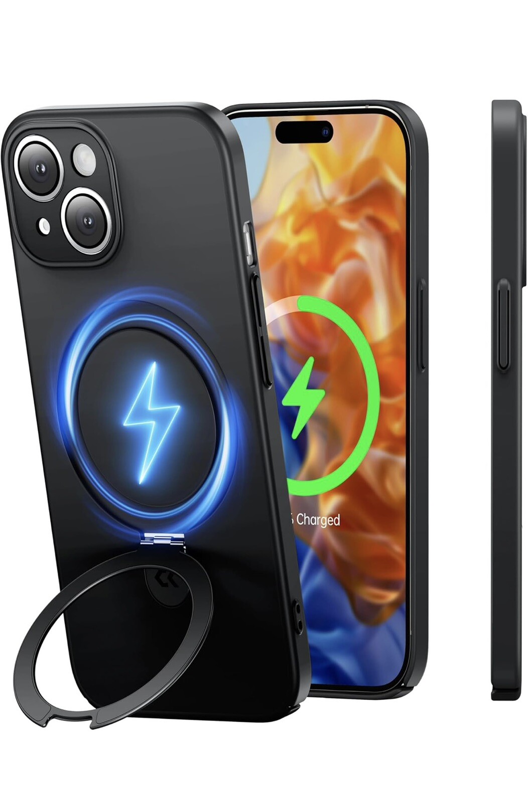 Magnetic Stand Slim-Fit for iPhone 15 Case [MagSafe-Compatible][Lens Protection][Ultra Thin][Velvety Touch][Cushioning Cotton] Matte Hard Anti-Scratch Case for iPhone 15, Gemstone Black