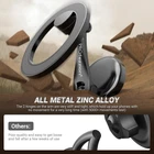【Designed for iPhone 16/15/14/13/12 Series 】Magnet car phone holder mount is specifically designed for magsafe iPhone 16 15 14 13 12 Pro Max Mini and official mag safe cases. If it is used with other phone models or non-Mag Safe cases, need to be used with the 3M metal adhesive ring.(Metal ring will not interfere with wireless charging) 【2 x 180° Folding & Double 360° Rotating】Car phone holder mount with 2 x 180° extension arms and 2 x 360° rotation design allows for multi-angle options to ensure you get the best view possible. Magnetic car holder designed for one-handed operation, freeing your hands for safe driving. It doesn't take up much space in your car and obstruct view, suitable for any car. 【Upgraded Super Magnets】Mag safe Magnetic Phone Holder built-in 20 upgraded N52 super magnets, provide superb suction to stabilise the phone on the car mount. It is used for dashboards, instrument panels, screen backs, desktop, kitchens and other applicable areas. 【High-quality Material】Mag Safe car mount is made of high-quality all-metal zinc alloy with a smooth surface, finely textured, beautiful and durable, and will not break like other plastic stands. Magnetic Car Phone Mount has a hollow design that does not interfere with signal and keeps navigation and calls running smoothly.(Note:Hole is not large enough for a popsocket) 【Strong Adhesion & Extremely Stable】3M VHB adhesive pad provides strong adhesion between dashboard and car phone mount, leaving no trace after removal. Sticks securely to any flat surface of the car, holding your phone and adapting to all road conditions such as hard braking, speed bump, and rugged mountain road. 【Warm Tips】1.The mounting surface will be wiped and wait for it to dry; 2.Install it in the area position and press it for 20 seconds; 3.Wait more than 24 hours to use; 4.Not suitable for use on leather, oiled, uneven surfaces.(Note: Car phone holder is a MagSafe ring magnet, the middle is not magnetic) 【What You Get】Magnetic Car Phone Mount x1, 3M Back Adhesive x1, 3M Adhesive Metal Ring x1, Clear Protective Film x1, Wet Cleaning Wipe x1, Instruction Manual x1, Metal Ring Positioning Operation Instruction x1 and 1-year warranty.