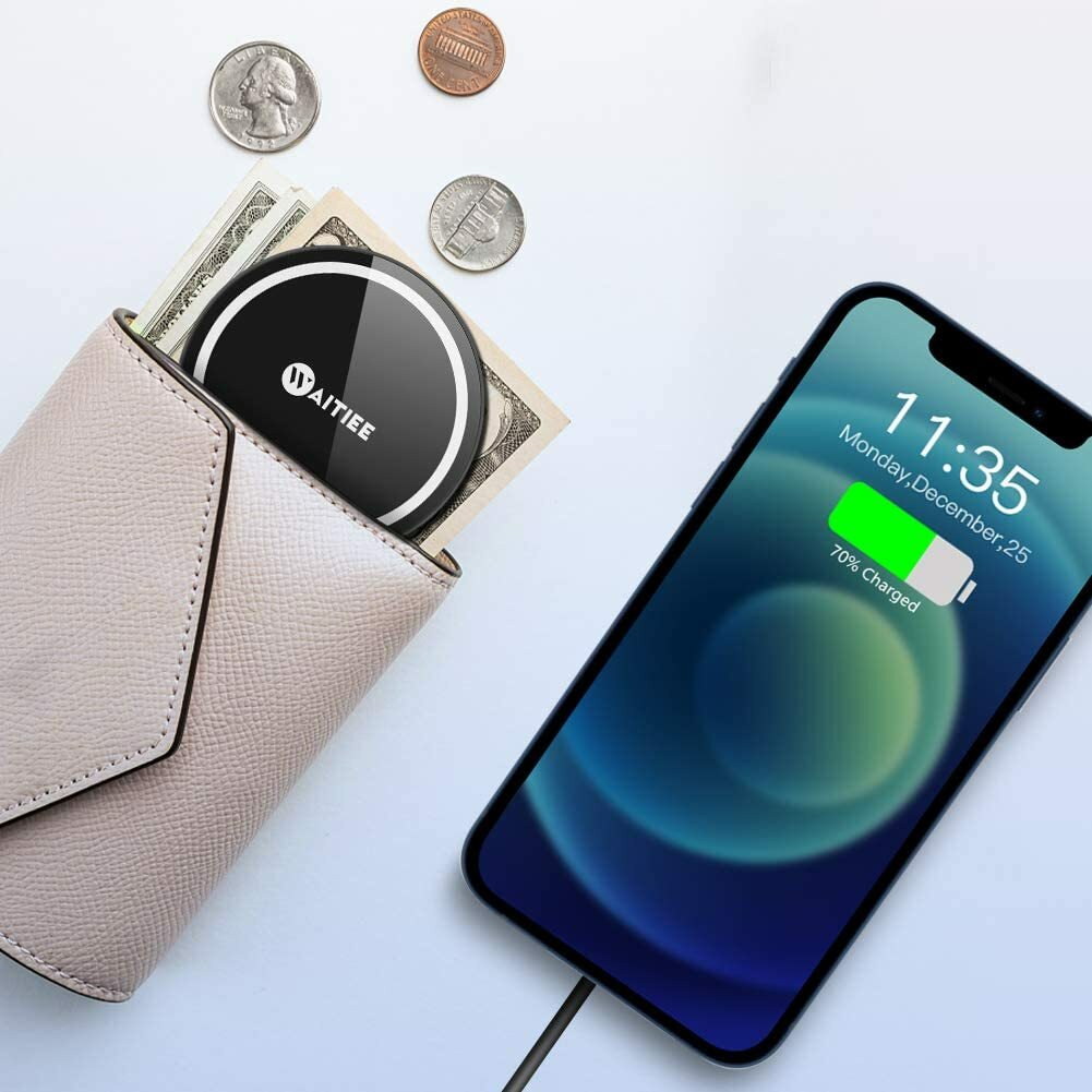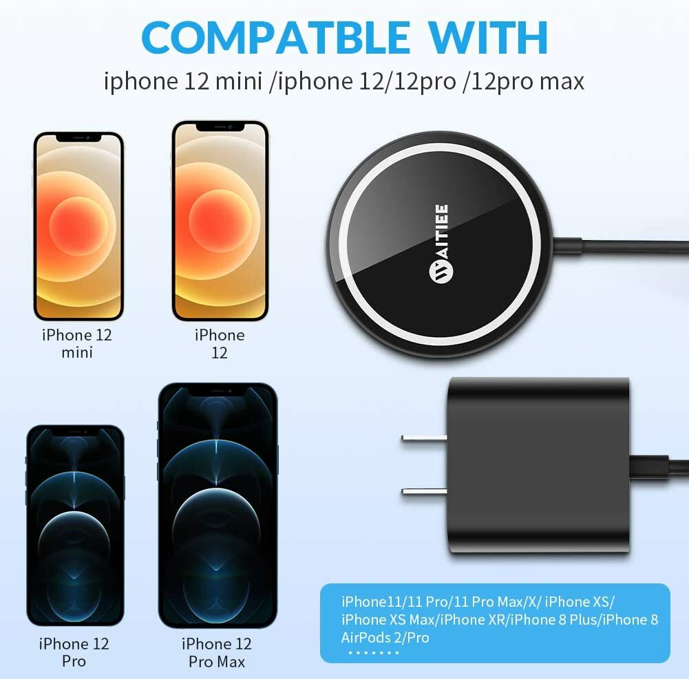 About this item 【20W Adapter Included】: We have included a 20W Tpye -C adapter, which can provide fast charging up to 15W for our wireless charger at home, in the office, or on the travel. 【Magnetic charging】: This magnetic wireless charger makes charging easier and more convenient. The strong magnetic force can be perfectly aligned with the charging coil set on the back of the 12 model, you can freely adjust the charging Direction, the charger's alignment function will ensure that it will not leave the charging center . 【Adapted models】: This magnetic charger is not only compatible with iPhone 12, iPhone 12 Pro, iPhone 12 mini, iPhone 12 Pro Max, Samsung Galaxy Buds, AirPods models with wireless charging boxes. And it is applicable to other support wireless charger mobile phones.NOTE: The magnetic alignment experience is only applicable to iPhone 12 mini / 12/12 Pro / 12 Pro Max. 【Portable and user-friendly design】: Glass panel, rubber ring design at the rear to prevent sliding during charging; compact design, size 58mm*7mm, can be easily put into you In your wallet and pocket, it is a good travel companion. No noise and flickering lights can provide you with a safe charging service even in the middle of the night. 【Entertainment Companion】: Charging becomes simpler. You can play games or watch videos while charging, It has a comprehensive intelligent protection technology that can provide temperature control, overvoltage With functions such as over current protection, short circuit protection and foreign object detection, so you can enjoy fast wireless charger. Intelligent Protect Loadingoverheat/overvoltage/overcurrent protection of the charger will ensure safe charging. You will get 1*20w adapter 1*magnetic wireless charger 1*Specification Compatible models This magnetic wireless charger makes charging easier and more convenient,The strong magnetic force can be perfectly aligned with the charging coil set on the back of the 12 model, while also charging your Air pods 2/pro. 1.Magnetic Charging 2.Lightweight and Portable 3.The magnetic alignment experience only applies to iPhone 12 mini/ 12/12 Pro/12 Pro Max. 20W Adapter Included Get the most out of your charger, every time. With the included 20W adapter, you can connect directly to a wall outlet for a consistent 15W charge. Rubber anti-skid ring The rubber ring is added to the bottom of the wireless charger to make the charging more stable and will not slide easily Compact design The width of the WAITIEE wireless charger is 2.5 in, the thickness is only 0.28 in, and the compact design would not occupy the desk area, the magnetic coil will automatically be aligned when charging for a better charging experience.
