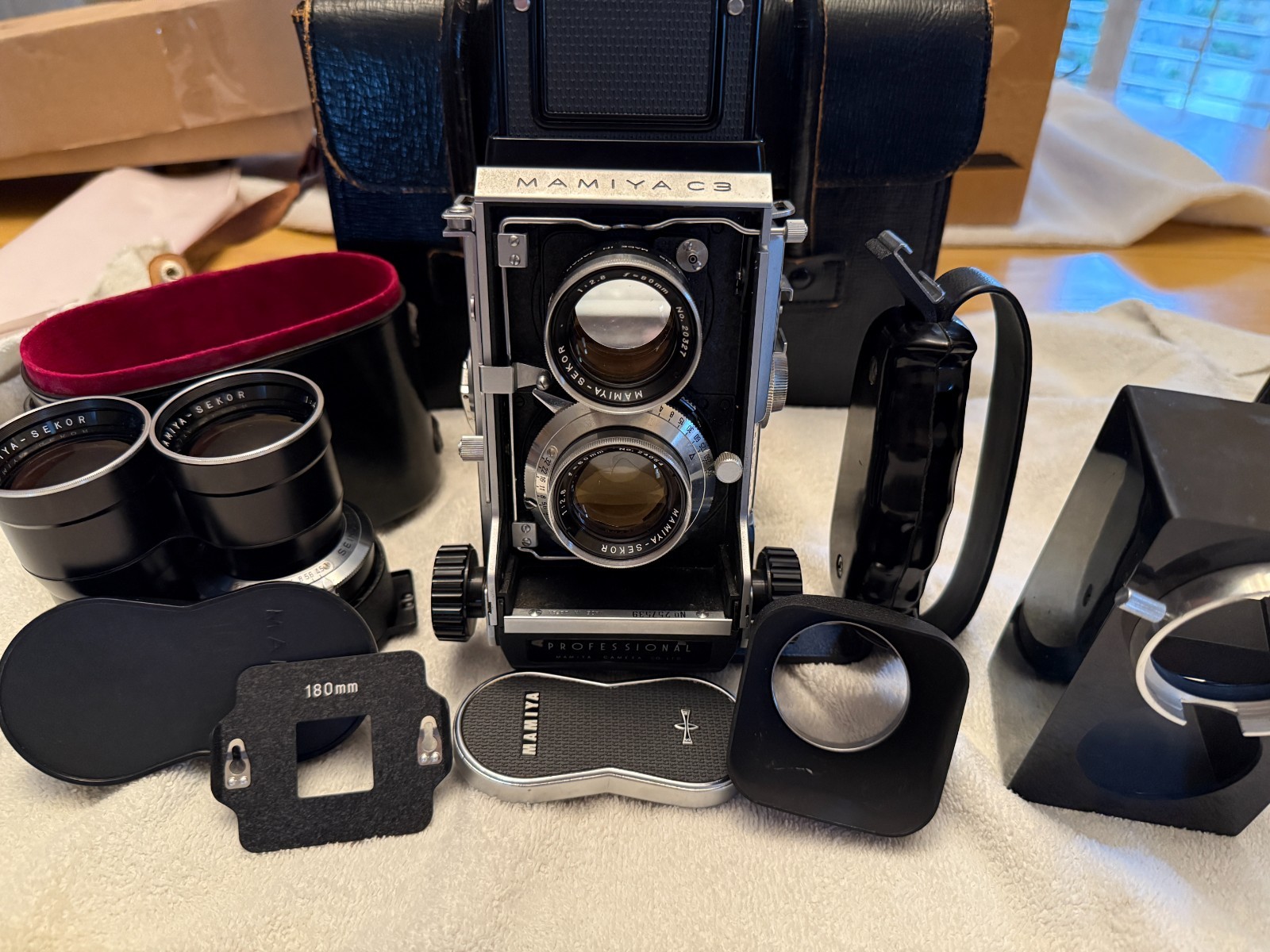 In Excellent Condition. Some wear due to aging. 18cm lens has fungus in the viewing optics, but the front optics are fine. 80mm lens optics are in great condition. The camera case is in OK shape and the kit bag is deteriorating. There is a musty smell from the camera, but the only issue I have observed is with the 18cm lens. The fungus doesn't appear to affect images, but likely needs a cleaning. Shutter timing sounds accurate. Viewing screen in good shape. Shutter releases fine. Film advances with crank. There is a small scratch on the top of the 18cm lens due to the way lenses are changed on the camera. The pictures were taken around Christmas this year in California with blaring sun. I have never shot manual or with a TLR so I literally have no idea what I am doing. Includes: Mamiya C3 Professional Camera with Case Mamiya-Sekor 80mm 1:2.8 Lens Mamiya-Sekor 18cm 1:4.5 Lens with Case and Front and Back Caps Camera Grip 180mm sportsfinder mask Two lens hoods Kit bag