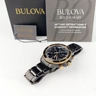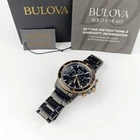 Men's Bulova Marine Star 98B302 Black Dial Stainless Chronograph Quartz Watch General Specifications Brand: Bulova Series: Marine Star Model: 98B302 Gender: Men's Packaging: Official Bulova Packaging Product Specifications Watch Movement: Quartz Display: Analog Water Resistance: 200 meters / 660 feet Date: Yes Chronograph: Yes Luminescent Dial Or Hands: Yes Case Specifications Case Shape: Round Case Material: Stainless Steel Dial Colour: Black Glass Type: Mineral Crystal Glass Case Width: 45 mm Case thickness: 15 mm Strap Specifications Strap Type: Stainless Steel Bracelet Strap Colour: Black Band width: 22 mm Band Color: Matte Black Ion-plated Clasp Type: Fold Over Clasp Bezel Color: Rose Gold Ion-plated Hands: Luminous Rose Gold-tone Crystal: Scratch Resistant Mineral Functions: Chronograph, Date, Hour, Minute, Second Product Description Bulova Mens Marine Star Black Chronograph 98B302 watch combines a 45mm round shaped stainless steel case and black stainless steel bracelet with a fold over clasp. It has a black analogue dial which is protected beneath mineral crystal glass. Power is generated by the quartz movement. This model also has a water resistance of up to 200 metres. Matte black ion-plated stainless steel case and bracelet. Fixed rose gold ion-plated bezel with matt black ion-plated top ring. Black dial with luminous rose gold-tone hands and index hour markers. Minute markers around the outer rim. Dial Type: Analog. Luminescent hands and markers. Date display at the 6 o’clock position. Chronograph – three sub-dials displaying: 60 second, 60 minute and 1/10th of a second. Quartz movement. Scratch resistant mineral crystal. Fold over clasp with a safety release. Shipping *We ship in within 1 or 2 business days after payment is received except holidays & weekend. Returns *We accept returns within 30 days of purchase. ❀Thank you for shopping with us!❀