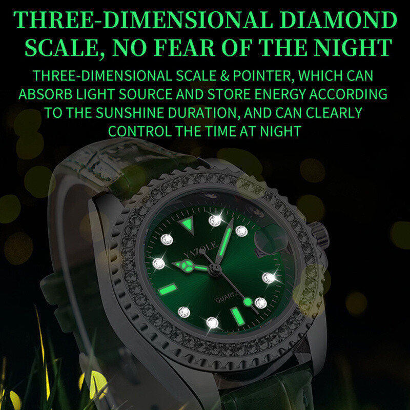 Product Description If you have any questions, please contact customer service first, do not open disputes easily, thank you! Features: 1. Sunburst green dial, pleasantly bright full diamonds set in the case, embellishing the wrist, showing the mysterious temperament of the combination of elegance and quality. 2. The fresh green elf on the wrist wears this touch of green, stunning the whole scene. 3. Hand-set 360° star diamonds, starlight circle full of flowing small diamonds, sparkling like a starburst, with its own light. 4.2.5 times calendar window, 3 o'clock calendar window, 2.5 times enlargement, view the calendar more clearly. 5.Three-dimensional diamond-set scale, fearless of the night, can absorb the light source according to the length of the sunlight to store energy, can also clearly control the time at night. Specification: Color: green Case: Metal Movement: single calendar movement Mirror: mineral reinforced Package Included: 1*Watch Note: 1. Please allow 1-3 mm error due to manual measurement. Please make sure you don't mind before ordering. 2. Please allow 1-3g weight error. Please make sure you don't mind before ordering. 3. Due to the lighting of the photos and the difference of monitors, the pictures may not reflect the actual color of the real item. Please make sure you don't mind before ordering, thank you! About Us We accept all payments authorized by eBay. About Us We accept all payments authorized by eBay. powered by