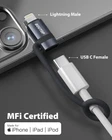 About this item !!! Does Not Support CarPlay, Headphones, Card Reader, USB Flash Drive, MIDI Keyboard, Mouse, U Disk, Hubs, Microphone, Yubikey etc Avoid the Hassle of Carrying Extra Cables: This USB C female to Lightning Male Adapter supports charging Lightning devices through Type-C cables, directly making Lightning devices compatible with USB C cables Supports PD Charging Adapter: With 36W PD fast charging, you can quickly charge your iPhone to 70% in just 30 minutes, and the MFi chip ensures a reliable and efficient charging experience Heat Dissipation & Anti-Lost Design: Aluminum alloy shell ensures heat dissipation. Equipped with 2 silicone rings, you can easily attach the adapter to your frequently used cables, perfect for storage and carrying at home, office, in the car or when traveling
