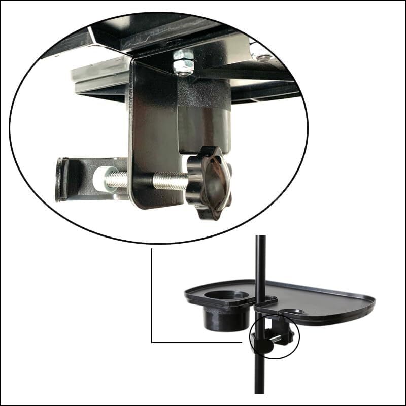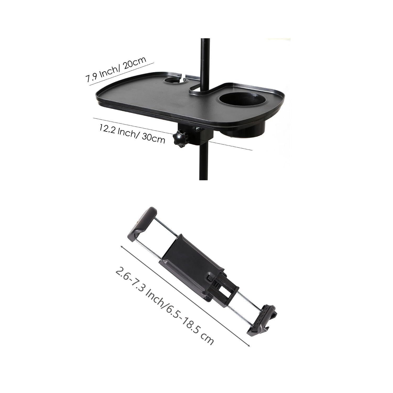 The microphone stand tray with a cup holder is a versatile accessory designed to enhance your recording or performance setup. This convenient tray easily attaches to your microphone stand, providing a stable platform for your water cup while you focus on your work. Crafted with durability in mind, the tray is a practical solution for keeping your hydration within reach during long sessions or performances. Its user-friendly design ensures quick and secure attachment to most microphone stands, offering a seamless and efficient solution for musicians, podcasters, and performers seeking a functional and organized workspace. 🌿【Compatible With】 The opening diameter can be adjusted better and firmly grasped the pole when fixed, fits tubing up to 0.5-1.4 inch(1.27-3.56 cm). This Phone Holder Microphone Stand Tray is suitable for most microphone stand/music sheet stand/speaker stand/selfie light stand/phone tripod . Notice: Please check if this mic stand tray is workable for your device before purchasing. 🌿【ABS Material for Durable】 The heavy-duty microphone stand tray is made of premium durable ABS material, which max loads 3kg/6.6 pounds to support most equipment. The mic stand holder tray measure size is 7.8in x 11.7 in (20cm x 30cm), width enough to meet your daily needs. 🌿【Multifunctional Tray】 This tray holder is additionally designed with a 1.6"/4cm diameter microphone holder, drink holder, headphopne holder and adjustable phone holder for live stream, live show or video chat, and it can fit most cell phones and IPAD (2.6"-7.3”) inches in width. 🌿【Adjustable Design】 After the music stand tray is installed, you can switch the height you want at will by adjusting the screw tightness. 🌿【Wide Application】 The universal microphone stand tray is perfect for stages, offices, lecture halls, recording studios, offices, webinars, meeting rooms or your own home. Great for holding small accessories like capos, harmonics, cell phonees, picks, phones, small percussion.