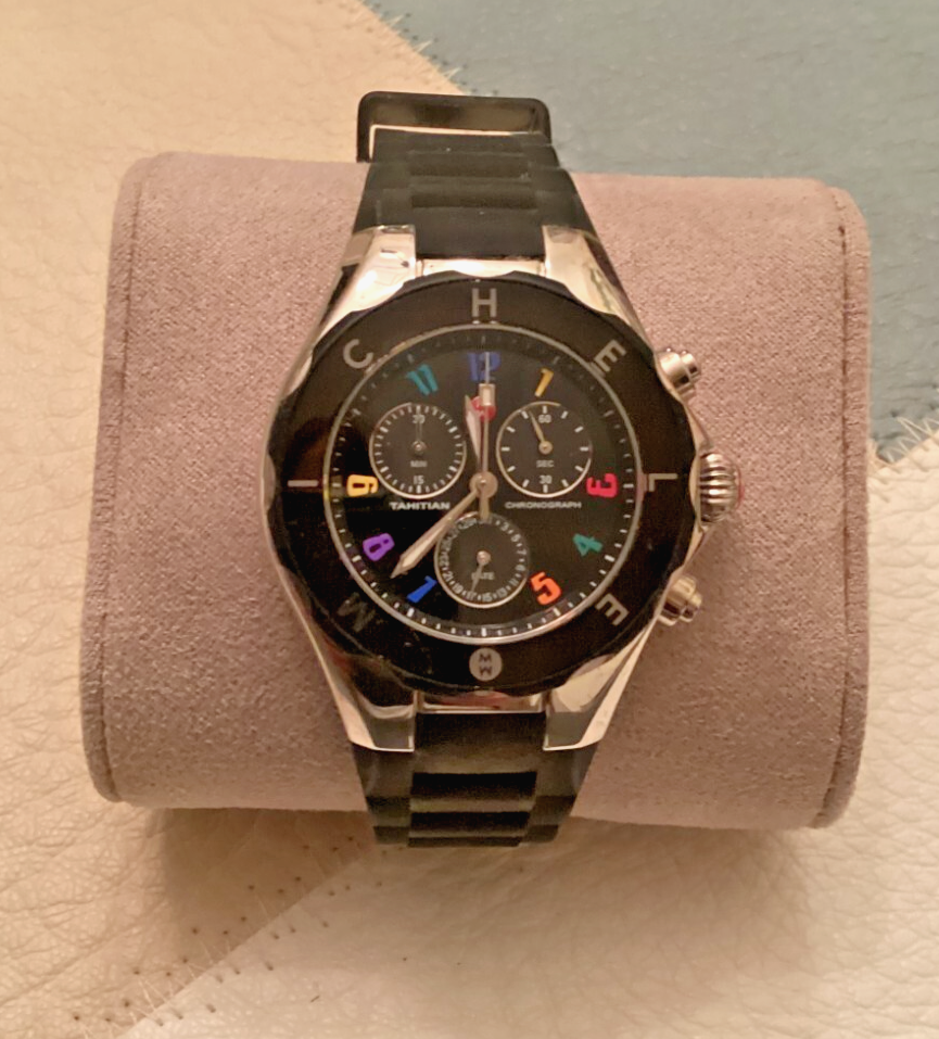 The Michele Tahitian Jelly Bean Multi Color Watch in Black is a stylish and versatile timepiece designed for women. This luxury watch features a silver case with a polished finish and a black silicone band for a sleek and modern look. With a quartz movement and water resistance up to 50m, it is both practical and reliable for everyday wear. The watch also boasts various features such as a chronograph, alarm, and 12-hour dial, making it suitable for various occasions from casual outings to formal events. The unique Tahitian Jelly Bean design adds a touch of sophistication to this classic and sporty timepiece. Needs a battery**