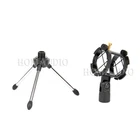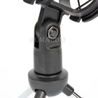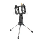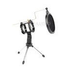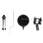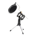 Desktop Tripod Shockproof Pop Filter Microphone Stand Holder + Shock Mount Tabletop Table Desk Top Mic Stand Shock Proof Clip Shockproof Stand Features: With a lightweight but durable construction. Open the foldable metal tripod legs mounted with rubber pad to keep your equipment secure and stable. The Pop Filter made of high quality double nylon net filtering materials immediately improve the sound of your vocal recordings and help you with prevention against plosion and popping. Detachable designed for convenient storage and easy transport. Description: (1)Shock Mount Mic Holder+(1)Desktop Tripod Stand: Ideal for radio broadcasting studio, karaoke, home recording, and voice-over sound, etc. Equipped with super-stable Tripod Stand so that your microphone can be held safely and firmly. NOTE: Mic Holder is suitable for microphone of diameter less than 32MM. PLEASE CHECK the size of your microphone BEFORE ORDERING! (1)Pop Filter+(1)Pop Filter Holder Stick: Essential item for recording, speaking or singing. It will help to ensure your message loud and clear and banish the dreaded hissing and lisping sounds that come when pronouncing the letter "s" and the explosion of air that follows "b" and "p" with this microphone pop screen. Specifications: Material: Metal & Plastic & Nylon net Pop Filter Inner Diameter: 4"/10cm Tripod Height: 4"/11cm(Folded), 3"/8cm(Extended) Color: Black Package includes: 1x Pop Filter Holder Stick 1x Pop Filter 1x Shock Mount Stand Holder 1x Tripod Stand