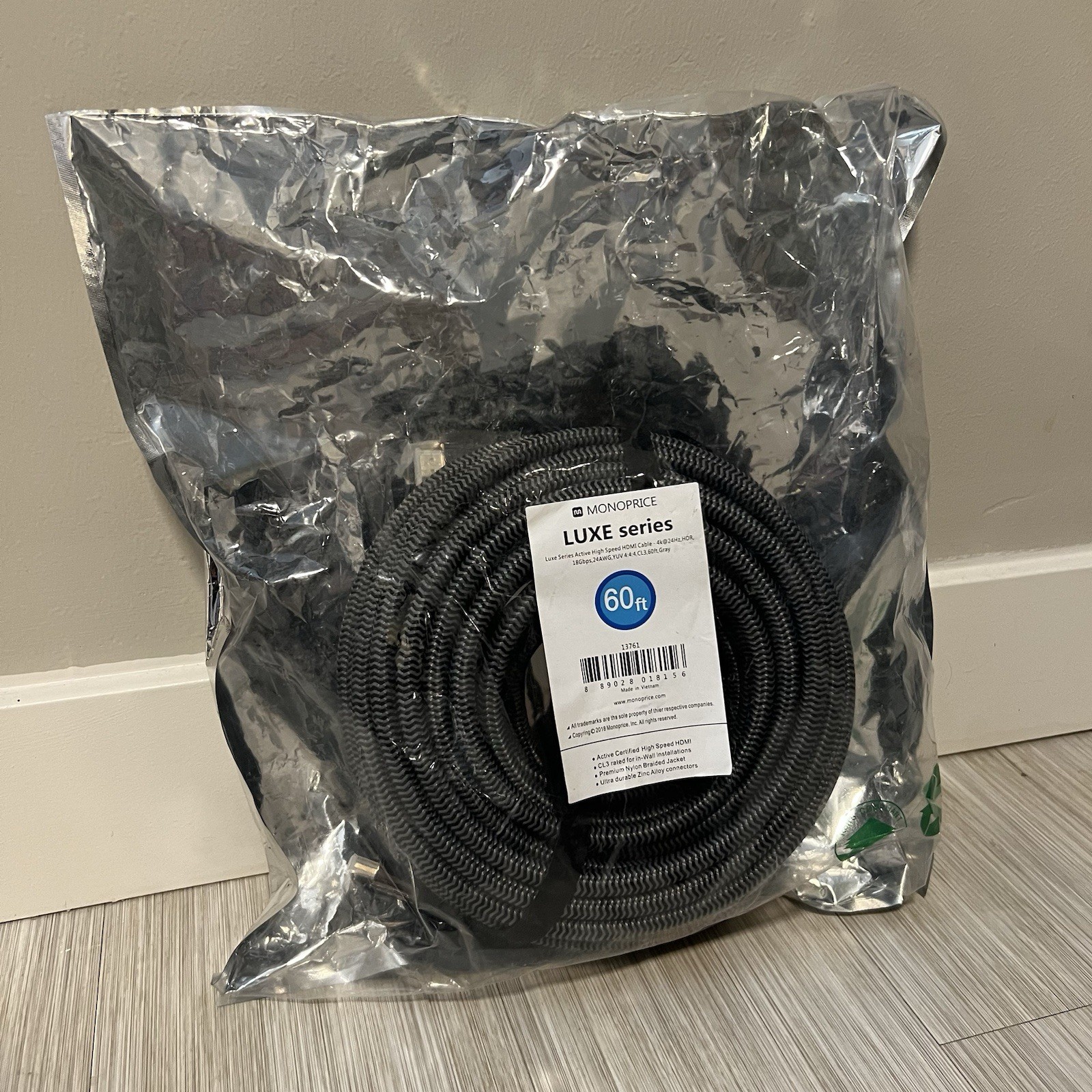The Monoprice LUXE Series 60ft HDMI Cable is a high-quality cable designed for 4k @24Hz and 18Gbps bandwidth, making it ideal for in-wall installations with a CL3 rating. The cable is compatible with a universal range of devices and features HDMI standard male connectors. With a sleek gray braided design, Monoprice's cable offers a reliable and long-lasting solution for your HDMI connectivity needs. This is brand new and unopened. It is also rated to be installed inside walls to be hidden. Product Specifications: - Star 4k @24Hz - HDR - 18Gbps - 24AWG wire - CL3 rated for in-wall installations - 60ft long - Premium nylon braided jacket