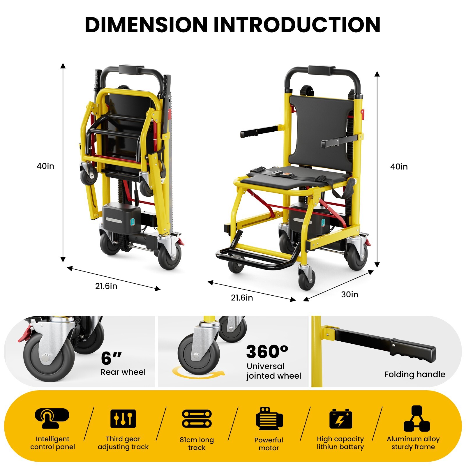Description Motorized Stair Climbing Wheelchair - Caregiver-Operated Mobility Solution Key Selling Points: 🚩 Safe & Smooth Stair Navigation Professional-grade crawler system handles straight stairs ≤50° slope 81cm extended track covers 3 steps simultaneously (no bumping) Anti-slip mechanism ensures safety even during mid-stair pauses 40 stairs/min (±5%) lifting speed with 353 lb (160kg) capacity ⚡ Power & Endurance 24V/13.6Ah removable lithium battery (international safety certified) Operates 500-1500 stairs per charge (load dependent) Waterproof circuitry & silent soft-start motor protection 🛠️ Smart User Features 4-speed adjustable backrest & vest-style safety harness Upgraded pedal footrest with speed control Sunk stainless steel buttons prevent accidental activation Air spring-controlled track deployment (one-step folding) 🚗 Portable & Space-Saving Folds to compact 41×22×12" (105×55×30cm) 57lb lightweight aluminum alloy frame 4x high-grip rubber wheels for flat surface mobility 🏥 Multi-Scenario Application Ideal for homes, hospitals & emergency response Converts to patient stretcher functionality Weather-resistant PVC fabric (fire/waterproof) Premium Build Quality: ✓ Military-grade aluminum alloy frame ✓ Electroplated eco-friendly coating ✓ Wear-resistant rubber track with reinforced ribs ✓ IPX4 waterproof rating for circuits Package Includes: 1× Stair Climbing Wheelchair 1× Smart Charger Technical Specifications: ▪ Power: 120W (AC100V, 50/60Hz) ▪ Dimensions: 49×22×64" (expanded)/41×22×12" (folded) ▪ Track Angle: ≤30° operational ▪ Continuous Operation: 500-1500 stairs Why Choose This Wheelchair? This professional-grade mobility solution empowers caregivers to safely transport users through multi-story environments without elevator access. Combining hospital-grade durability with smart home-friendly features, it's the optimal choice for families seeking independence and institutions requiring reliable patient transfer capabilities. On May 8, 2025 at 06:03:44 PDT, seller added the following information: