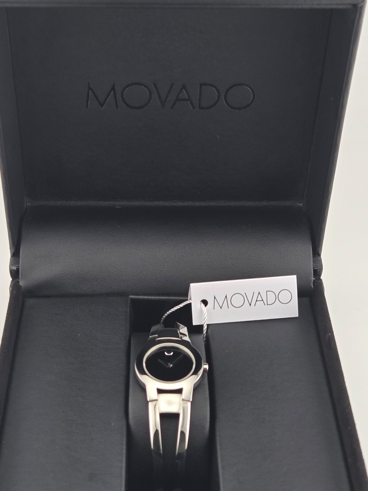 Movado Amorosa Women’s Black Dial Bangle Watch - 0604759 ($595 MSRP) New with Original Box and Tags! This watch is a Shelf Pull from one of the Major Department Stores. May find few micro scratches on the watch case/band, visible under a direct and strong light. Sleek, elegant, and undeniably refined, the Movado Amorosa Women’s Black Dial Bangle Watch (model 0604759) blends modern sophistication with timeless design. Crafted from polished stainless steel, the bracelet-style watch features a minimalist black dial accented by silver-tone hands and Movado’s iconic dot at the 12 o'clock position—an emblem of pure design simplicity. The round 24 mm case and ultra-slim 6.5 mm profile make it a lightweight yet striking statement piece. Powered by reliable quartz movement, this analog timepiece offers precision and longevity, protected under a scratch-resistant sapphire crystal. The fixed stainless steel bezel and solid case back add durability, while the jewelry clasp ensures a secure and seamless fit. The band’s slim 14 mm width and 6-inch length are tailored to flatter a woman’s wrist, making it perfect for both everyday wear and special occasions. With water resistance up to 30 meters (100 feet), the Movado Amorosa is suitable for light splashes and brief immersion, offering both beauty and practicality. Whether paired with a business suit or an evening gown, this watch exudes understated luxury and confidence. It’s not just an accessory—it’s a statement of style, precision, and enduring elegance. Features Stainless steel case with a stainless steel bracelet. Fixed stainless steel bezel. Black dial with silver-tone hands. No markers. The signature Movado dot appears at the 12 o'clock position. Dial Type: Analog. Quartz movement. Scratch resistant sapphire crystal. Pull / push crown. Solid case back. Case diameter: 24 mm. Case thickness: 6.5 mm. Round case shape. Band width: 14 mm. Band length: 6 inches. Jewelry clasp. Water resistant at 30 meters / 100 feet. Functions: hours, minutes. Fast and Free Shipping You're already purchasing the item. Why pay additional for shipping, especially slow shipping? We get your order shipped out within 1-business day and delivered to your doorstep as quickly as possible. Competitive Pricing With our dynamic pricing model, our prices are always competitive. Our prices are some of the lowest that you will find on the internet. Rest assured that you're getting a good deal when purchasing with us. 30-day Money Back Guarantee We are committed to making sure that you leave this transaction satisfied. If you're unhappy with the product for any reason, you may return it back for your money-back or a replacement within 30 days. No questions asked!