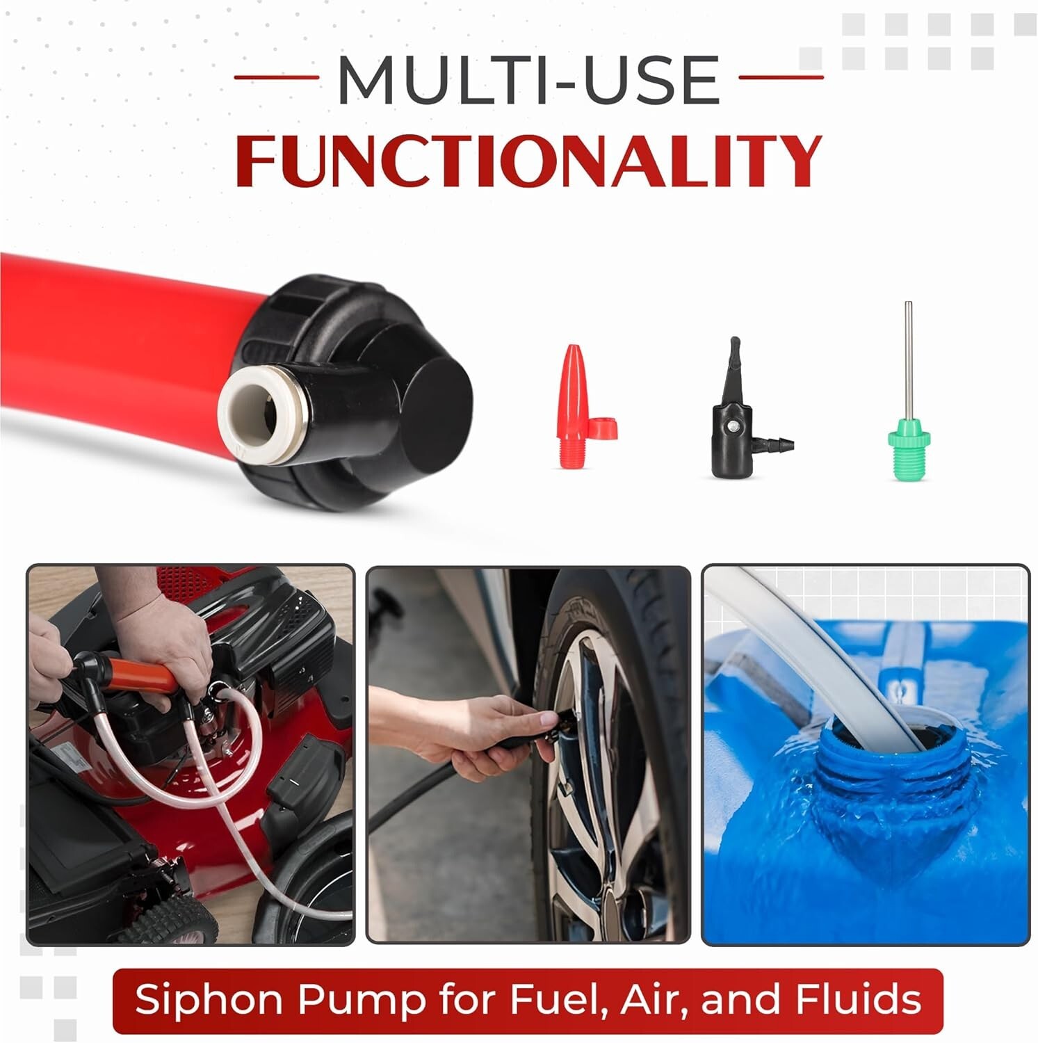 Versatile Multi-Purpose Siphon Transfer Pump Kit with Dipstick & Air Adapter ‹ › ‹ › ‹ › ‹ › ‹ › ‹ › ‹ › ‹ › ‹ › ‹ › ‹ › Versatile Multi-Purpose Siphon Transfer Pump Kit Discover the ultimate solution for liquid transfer and inflation with our multi-use self-priming siphon pump kit. Designed for your convenience, this essential tool allows you to extract and insert liquids like oil, gas, and water with ease. It also features an air pumping hose and adapter for all your inflating needs. Specifications: Gas Syphon Pump with intake & discharge tubes: 9” - 2 Hoses (with black connectors): each 50” (127cm), OD: 1/2”, ID: 11/32” Dipstick tube: 48”, OD: 1/4”, ID: 1/8” Air pressure tube: 15”, OD: 7/16”, ID: 1/8” Quality Construction: Durable hard plastic fluid pump ensures perfect pressure for rapid siphoning transfer. Thick plastic hoses prevent leakage or spills. Rubber dipstick tube effectively transfers oil without melting from heat. High-quality acid and water chemicals resistant equipment. Thoughtful Design: Smooth action handle with 2 long flexible red hoses for easy access to hard-to- places. Extractor dipstick tube efficiently sucks oil from any vehicle. Quick assemble/disassemble for hassle-free cleaning. Extensive Uses: Ideal for motor oil changes, overfilled tanks, fuel transfer, and draining liquids from transoms. Perfect for refueling tanks and transferring fluids from cars, trucks, tractors, and other outdoor equipment. Features an air inflating adapter for tires, balloons, and more! Efficiently removes liquid from aquarium tanks, unclogs plumbing, and separates sediment during brewing. Why choose our Siphon Transfer Pump Kit? Struggling with inefficient liquid transfer tools? Our versatile siphon transfer pump kit offers a leakage-free, quick, and easy solution for all your needs. Designed with quality materials and thoughtful features, it makes any liquid transfer or inflation job straightforward and efficient. Save money by handling your draining and transferring tasks yourself, ensuring you have the right tools to get the job done right. Experience the convenience and reliability of our multi-purpose siphon pump kit today! Shipping Free & Fast Shipping - We offer free shipping to most of the USA with a normal delivery time of 3-7 days. However, due to the current situation, additional delivery time (up to 3 weeks) may be required for some items. Alternative Carriers - We may use alternative carriers (e.g. USPS, FedEx, UPS, etc.) to ensure your package arrives safely and on time. Due to the use of multiple carriers, we are unable to provide a tracking number automatically. Handling Time - Orders are processed and shipped within 1-2 business days of receiving cleared payment. Shipping Restrictions - Shipping to Alaska, Hawaii, Puerto Rico, Guam, and other US territories may incur shipping charges or delivery restrictions. Please contact us before ordering, or your order can be refunded/cancelled. State Restrictions - There may be restrictions based on your state of purchase. For example, certain items may not be shipped to California due to state regulations. Contact for Tracking Updates - If you require tracking updates or have any concerns about the delivery of your order, please feel free to contact us, and we will be happy to assist you. Return 30-Day Hassle-Free Returns - We want you to be completely satisfied with your purchase. If you are not, you can return the item within 30 days of receiving it for a full refund or exchange. Easy Return Process - To start a return, simply contact us and we will provide you with a prepaid return shipping label and detailed instructions. Restocking Fee - There are no restocking fees for returns. However, the buyer is responsible for return shipping costs if the return is not due to a seller's error. Refund Processing Time - Refunds will be processed within 5 business days of receiving the returned item in its condition. Payment We accept all major credit cards, PayPal, and Apple Pay for your convenience. Your payment information is secure and encrypted to ensure a safe and seamless transaction. Please complete your payment within 3 days of purchase to avoid any delays in shipping. Feedback Your feedback is extremely important to us. We strive to provide the best products and customer service possible. If you are satisfied with your purchase, please take a moment to leave us a positive review. If you have any concerns or issues with your order, please contact us before leaving negative feedback. We are committed to resolving any problems and ensuring your satisfaction. Contact Us If you have any questions or concerns, please feel free to out to our customer support team. You can contact us through the eBay messaging system. We are available Monday to Friday, 9:00 am to 5:00 pm EST, and we will do our best to respond to your inquiry within 24 hours. Buy it now and enjoy a pleasant shopping experience! Model: Siphon Transfer Pump Power: Siphon Transfer Pump Unit Quantity: 13.7 oz Features: Submersible,Self-priming,Multi-use,Fluid transfer,Suction tool,Air pumping hose,Adapters for inflating tires,Durable hard plastic,Smooth action handle,Easy assemble/disassemble,Efficient cleaning,Leak-free operation,Flexible hoses,Chemical resistant,Air pressure adapter Type: Utility Pump Installation: Universal Installation Item Weight: 13.7 oz Maximum Flow Rate: 3 gal/min Unit Type: oz