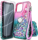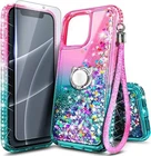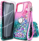 NGB Supremacy Compatible with iPhone 15 Case with Tempered Glass Screen Protector| Ring Holder/Wrist Strap| Bling Diamond Sparkle Liquid Glitter Girls Women Cute Phone Case (Pink/Aqua)