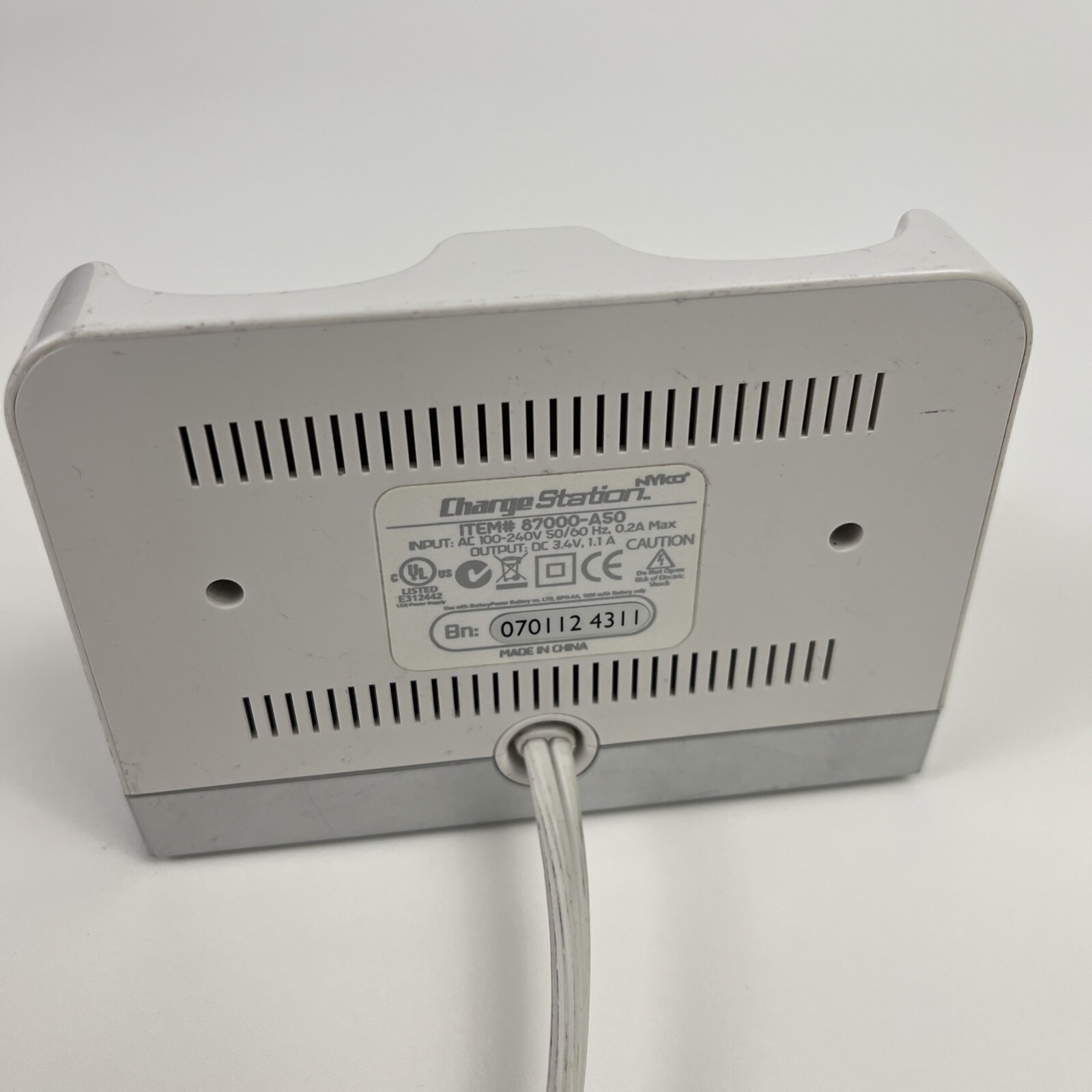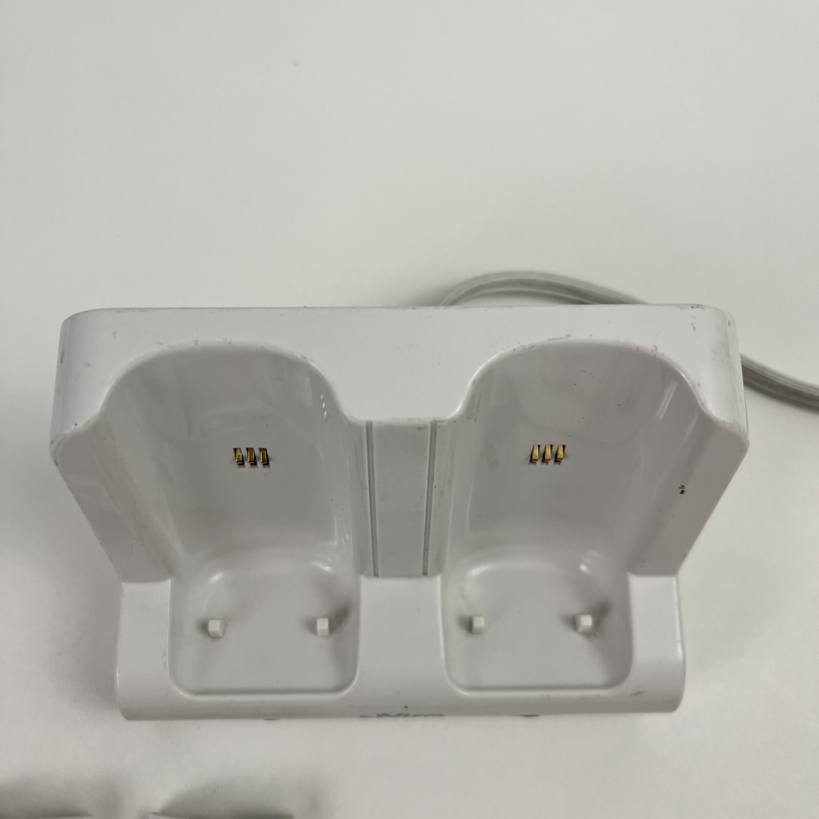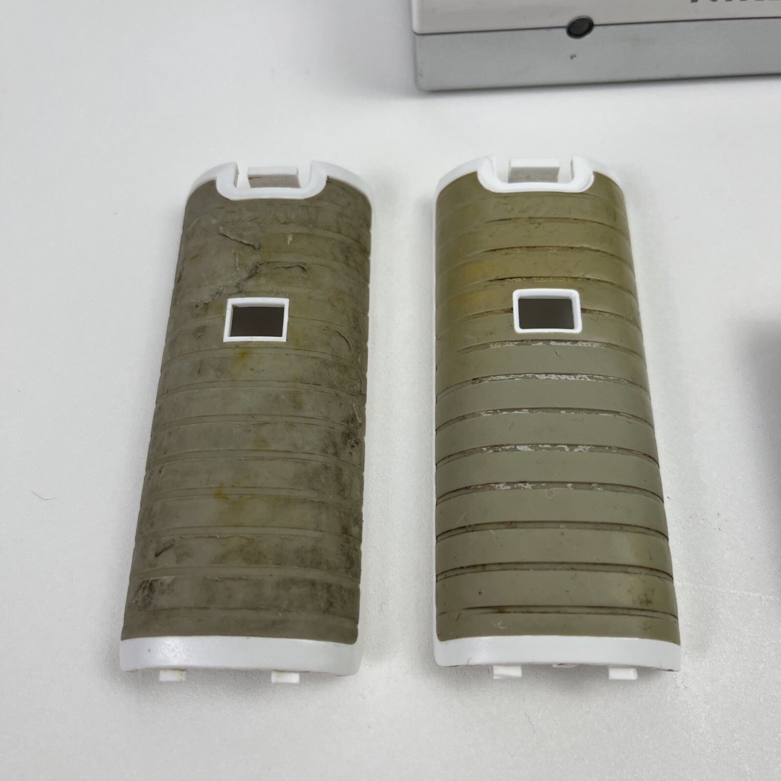 some discoloration and residue on both the charger and the backs (see photos) everything has been tested and was used, works perfectly fine includes one charging dock, with two rechargeable batteries and the respective nyko back covers *no controllers are included