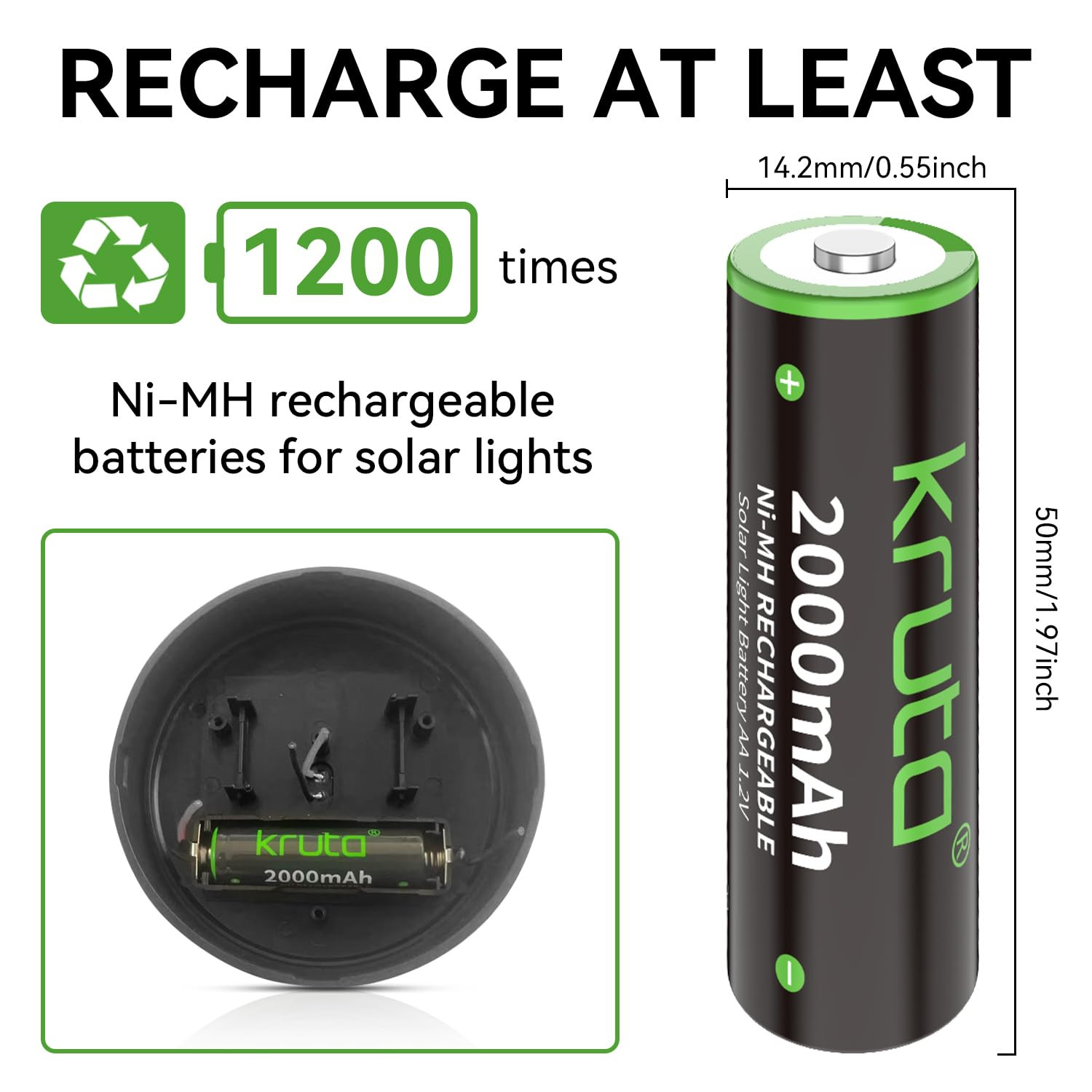 【High Capacity&Long Lasting】:2000mah high capacity AA rechargeable battery will lasting much longer time to ensure your outdoor lights always has enough power to light all night. Also can replace 600mAh, 800mAh, 1100mah, etc NiCd or Ni-MH AA cells AA battery. 【Multiple Daily Uses】: Standard aa size batteries can be used on various outdoor solar garden lights, mouse, keyboards, TV remotes, toys, game controllers, digital camera, will fit all your device perfectly in daily life usage, high quality AA rechargeable batteries supply long lasting power, great convenience and good performance. 【Upgraded Anti-leak and Low-self Discharge Technology】: With advanced and upgraded Low-Self Discharge and anti-leak technology, these aa rechargeable batteries can maintain more than 80% capacity for 3 years without leakage, won’t lose the maximum capacity, keeping the best performance and a longer battery life, good quality to save your money. 【Good Performance】: Much better high temperature performance than other type batteries, can be used in -4℉ to 140℉, They can be charged from the sun even in the snow. 【Support Two Ways charging Methods】: These rechargeable NiMH aa batteries can be charged via solar or standard aa battery charger. For better performance, suggest to use battery charger to fulfil the battery when the sunlight is no that enough to fully charge the battery.