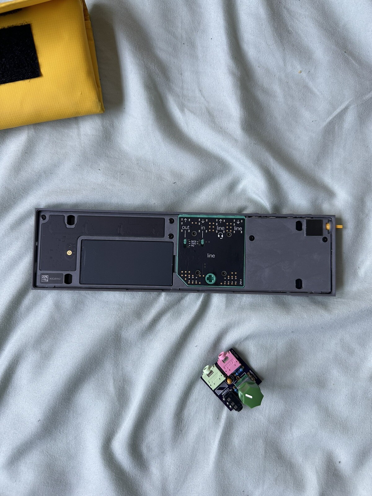 OP-Z + Line Module + dig dug diy splitter + Wooden Desk Stand + Usb C Cable + Roll Up Bag. Slight bending and double triggers are present, but the unit is still functional and works as intended
