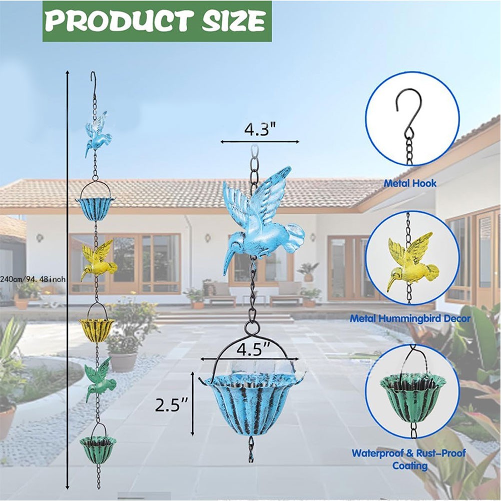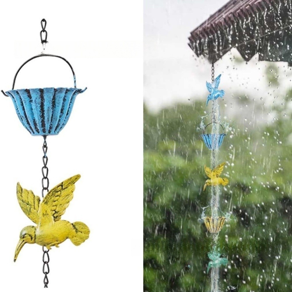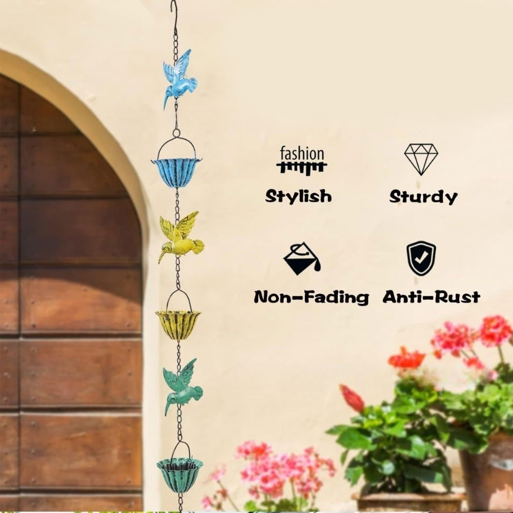 Beschreibung Features: *Graceful Rainwater Capture: This 7.8ft rain chain features wide, flared mouths and deep cups that channel rainwater effectively from your gutters to the ground, minimizing splashes and erosion while creating a soothing sound as water flows through. *Artistic Design Element: More than just a functional piece, this rain chain showcases 6 beautifully designed flower-shaped cups and 6 vintage bronze hummingbirds, turning your rainfall into an eye-catching vertical water feature that enhances your outdoor decor. * For Durable Construction: Made from premium steel with a protective anti-rust bronze coating, this rain chain is built to withstand various weather conditions. A weighted bird at the bottom ensures stability during storms, avoidance unwanted movement and splash-back. *Adjustable Installation: Installation is a breeze with the included S hook that allows for quick hanging on your gutter adapter (adapter not included). The chain can be easily adjusted by adding or removing links or cups, making it suitable for most single-story homes. *Perfect present Choice: Combining functionality and beauty, this decorative rain chain is a for IDEAL present for gardening enthusiasts, new for HOMEOWNERS , or anyone who appreciates the serene charm of rain. It’s perfect for occasions like Christmas, birthdays, or housewarming parties. Specifications: *Product Name:Bird Cup Chain *Material:metal *Size:94.48inch,240cm *Color:blue,yellow *Number of Pieces: 1pcs Cup Chain Package Content: 1pcs Cup Rain Chain Note: 1. The real color of the item may be slightly different from the pictures shown on website caused by many factors such as brightness of your monitor and light brightness. 2. Please allow slight manual measurement deviation for the data. POLICES Shipping Payment WARRANTY We only ship to confirmed ebay Order addresses. Please comfirm that your Order address is in line with your shipping address. Please kindly note that the c ombined shipping is not provided because the shipping fee is calculated by weight. Also, the each additional item means exactly the the same color and size. It takes about 7 -15 working days to US; about 10-30 working days to other countries. Transit time may be a little delayed because of the bad weather and customs inspection . If you do not receive your item within 30 working days since payment finished, please contact us immediately for further assistance. Payment must be completed within 5 days. If you have any problems about payment, please contact us via ebay message. We strive for 100% customer satisfaction! Positive Feedback is very important to us. If you have any questions, p lease feel free to contact us via "Ask seller a question" . We will reply your email within 24 working hours.