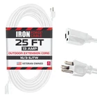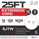 Conquer Any Weather: This 16-gauge extension cord boasts a SJTW cable that is resistant to water, snow, and sunlight. It's flame-resistant and stays flexible even in freezing temperatures (-40°F to +140°F), making it a great outdoor extension cord. Powerhouse Performance: Handle demanding tasks with the thick 16 awg solid wire. This 25ft heavy duty white extension cord is a multi-purpose workhorse, ideal for powering small household appliances, lawnmower, garden tools, printer and even for landscaping and outdoor lights decoration. Use it indoors or outdoors for ultimate versatility. Built to Last: Forget flimsy cords! The nickel-coated blades resist corrosion and prevent bending or breaking. The slip-resistant design and strain ensure a secure, uninterrupted connection on this 16/3 extension cord. UL Certified: 16 gauge/16 awg, SJTW, 3 wire grounded, 25 foot long extension cord, white cable, 13 amp, 125 volt, 1625 watt, 5-15P/R, nickel coated blades. Integrity in Service: , a U.S. veteran-owned business, stands behind its products. We're here to help resolve any issues that you may have.