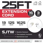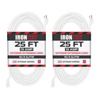 Safe, Efficient Household/Indoor Extension Cord Iron Forge Cables’ 6 Ft Extension Cord is the perfect power cable for all your home electrical needs. It offers durable strain for optimal performance, and a 3 prong grounded molded male plug for added safety. The cord’s 6 foot length gives good reach across most rooms. UL Listed. Perfect for Home Use Whether you want to power your TV, game console, computer, lamp, blender, toaster, microwave, Christmas decorations, vacuum, or other appliances, this high quality extension cord is designed to meet all your needs and hold up well. It’s both water resistant and flame retardant. The vinyl covering protects the cable against abrasion and direct sunlight. And the extension cord's white color is easy to see for extra safety.4 ft extension cord 4 foot extension cord 6 ft extension cord 6 ft extension cord white white 6 foot cord extension cord for refrigerator 6 foot extention cords single outlet extension cord white extension cord heavy duty extension cord white 6' outdoor flat plug cord extention cords indoor heavy duty white extension cord white indoor extension cord extension cord clips 3 prong extension cord 6 foot extension cord Conquer Any Weather: This 16-gauge extension cord boasts a SJTW cable that is resistant to water, snow, and sunlight. It's flame-resistant and stays flexible even in freezing temperatures (-40°F to +140°F), making it a great outdoor extension cord. Powerhouse Performance: Handle demanding tasks with the thick 16 awg solid wire. This 25ft heavy duty white extension cord is a multi-purpose workhorse, ideal for powering small household appliances, lawnmower, garden tools, printer and even for landscaping and outdoor lights decoration. Use it indoors or outdoors for ultimate versatility. Built to Last: Forget flimsy cords! The nickel-coated blades resist corrosion and prevent bending or breaking. The slip-resistant design and strain ensure a secure, uninterrupted connection on this 16/3 extension cord. UL Certified: 2 pack, 16 gauge/16 awg, SJTW, 3 wire grounded, 25 foot long extension cord, white cable, 13 amp, 125 volt, 1625 watt, 5-15P/R, nickel coated blades. Integrity in Service: , a U.S. veteran-owned business, stands behind its products. We're here to help resolve any issues that you may have.
