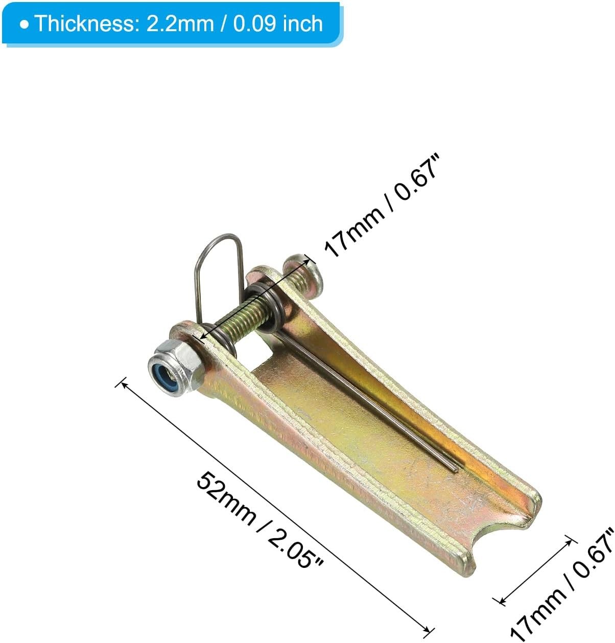 PATIKIL 2 Inch Hook Safety Latch Kit, 4 Pack Metal Towing Hitch Replacement for Clevis Hook Trailer, Golden Tone Product Details Brand: PATIKIL Item Weight: 0.08 Kilograms Vehicle Service Type: Van, RV, Car, Truck Material: Metal Finish Type: Powder Coated Manufacturer: PATIKIL Item Weight: 2.82 ounces Package Dimensions: 3.66 x 2.48 x 0.67 inches Country of Origin: China Item model number: Modern Manufacturer Part Number: pta230720tt000129 Brand: PATIKIL Item Weight: 0.08 Kilograms Vehicle Service Type: Van, RV, Car, Truck Material: Metal Finish Type: Powder Coated Overall Length: 52mm / 2.05 inch; Outer Width: 17 x 17mm / 0.67 x 0.67 inch (Top*Bottom); Package List: 4 x Hook Safety Latch Kit Advantages: Sturdy metal material, fine workmanship, rust-resistant, handy and durable. Spring-loaded designed latch for quick release. Applications: This safety latch is fit for hitches, trailer wiring, cargo management, and more. It is for secure attachment and quick release as needed. Instruction: Easy to use. Replace the latch on clevis hook in daily applications NOTE: Before placing the order, please confirm the size This safety latch is fit for hitches, trailer wiring, cargo management, and more. It is for secure attachment and quick release as needed.SpecificationColor: GoldenMaterial: MetalThickness: 2.2mm / 0.09 inchOverall Length: 52mm / 2.05 inchOuter Width: 17 x 17mm / 0.67 x 0.67 inch (Top*Bottom)Package List: 4 x Hook Safety Latch KitAdvantagesSturdy metal material, fine workmanship, rust-resistant, handy and durable. Spring-loaded designed latch for quick release.InstructionEasy to use. Replace the latch on clevis hook in daily applications.NoticeBefore placing the order, please confirm the size.