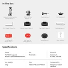 PGYTECH CapLock Action Camera Helmet Mount Model :P-GM-225 Weight capacity: 300g; ●Quick Release System ●The PGYTECH CapLock system eliminates the tedious process of rotating and removing traditional sports camera interface knobs, realizing one-step installation, and the dual-lock design enhances security. ●Universal Compatibility ●Including an action camera adapter and a 1/4" adapter, it works well with action cameras and smartphones. (A phone clamp is needed when used with smartphone) ●360° Panoramic View ●The dual-ball magic arm provides a complete panoramic view with a single locking wingnut for rapid adjustments. Robust aluminum alloy combined with plastic brings a sturdy and enduring construction. ●Liberate Your Hands ●Mount your action camera on smooth surfaces like helmets or dashboards to capture moments spontaneously during your activities. The adhesive base can be detached from the main body, allowing effortless gear removal and easy installation ●Safe and Steady Connection ●3M VHB adhesive base ensures a rock-solid connection. Attach the safety base to your helmet's side so that you can fix your gear to the safety lanyard. To prevent accidental falls, we suggest use it with a safety lanyard, and keep the driving speed under 80km/h. Specifications Main material: Aluminum, PC+ABS, Silicone Packing size: 192mm*96mm*43mm Product size: 134mm*48.5mm*43mm Weight (With Package): 250g Weight (Net Weight):177g Weight capacity:≤300g; Working temperatures:-10℃-40℃; Note: When temperature is ≥10℃, press and adhere the base, then wait at least 24 hours before installing the mount; When temperature is <10℃, heat the base tape with a hairdryer, then press and adhere the base, and wait at least 24 hours before installing the mount. Certification :RoHS In the Box CapLock Action Camera Helmet Mount*1 CapLock Action Camera Adapter*1 Thumbscrew*1 CapLock 1/4" Adapter*1 S4 L-shape Allen Wrench*1 Flat Mount Base*2 Curved Mount Base*2 VHB Tape*2 Safety Base*2 VHB Tape For Safety Base*1 Safety Lanyard*1 User Guide*1