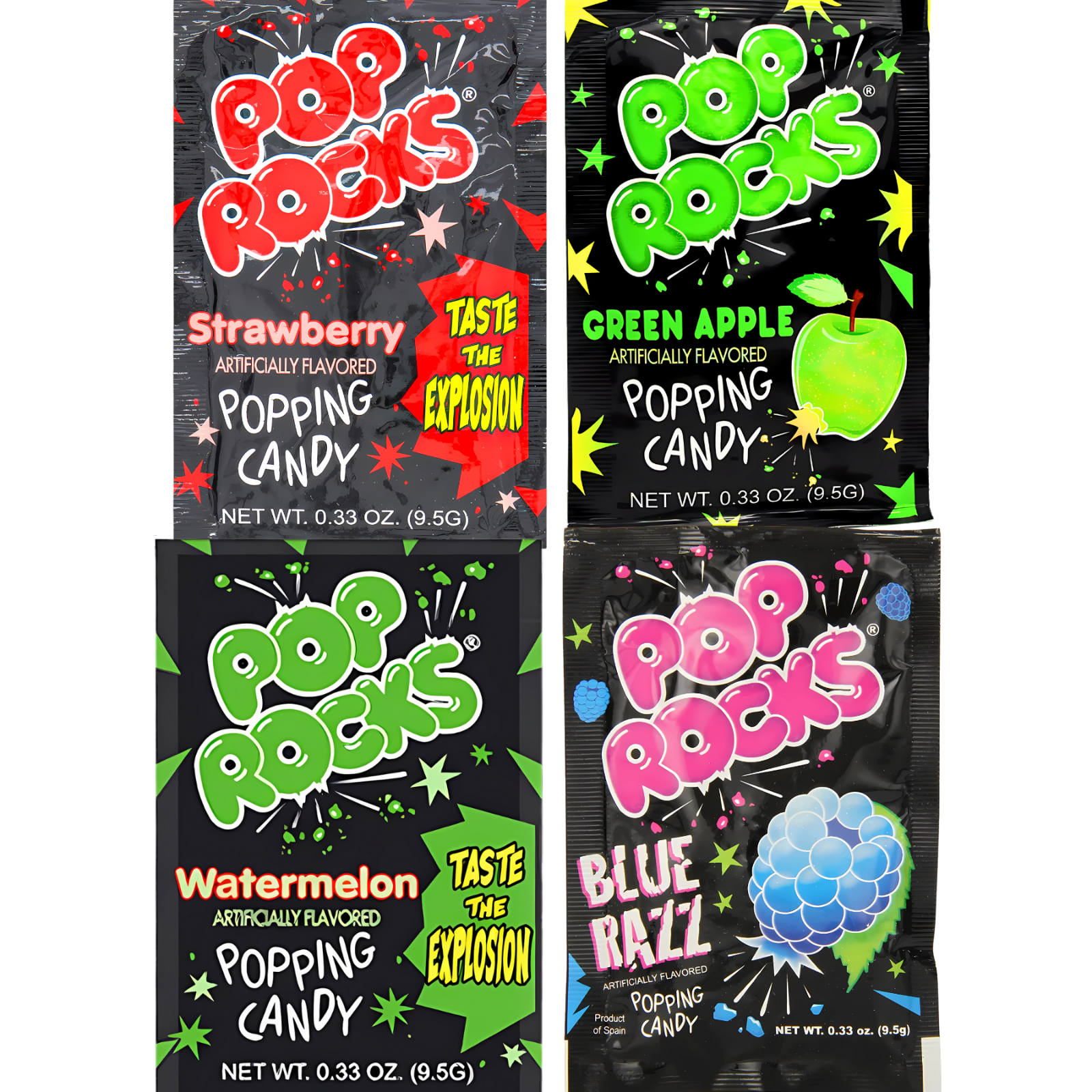 Pop Rocks Popping Candy – 4 Pack Variety (Blue Razz, Green Apple, Strawberry, Watermelon) Enjoy the crackling candy sensation with this 4-count variety pack of Pop Rocks. Each order includes one sealed pouch of each flavor: Blue Razz, Green Apple, Strawberry, and Watermelon. These classic popping candies are a favorite for party favors, gift bags, and nostalgic treats. Key Features: 4 individual bags – one of each flavor Flavors include Blue Razz, Green Apple, Strawberry, and Watermelon Fun and fizzy popping candy experience Great for kids, parties, and retro candy lovers Ships fast from a small family business Always fresh and factory sealed Perfect for birthday party favors, candy buffets, or a sweet blast from the past. Add some crackle to your candy collection today!
